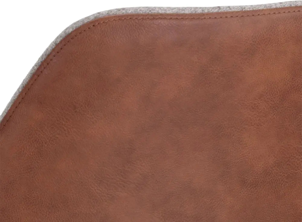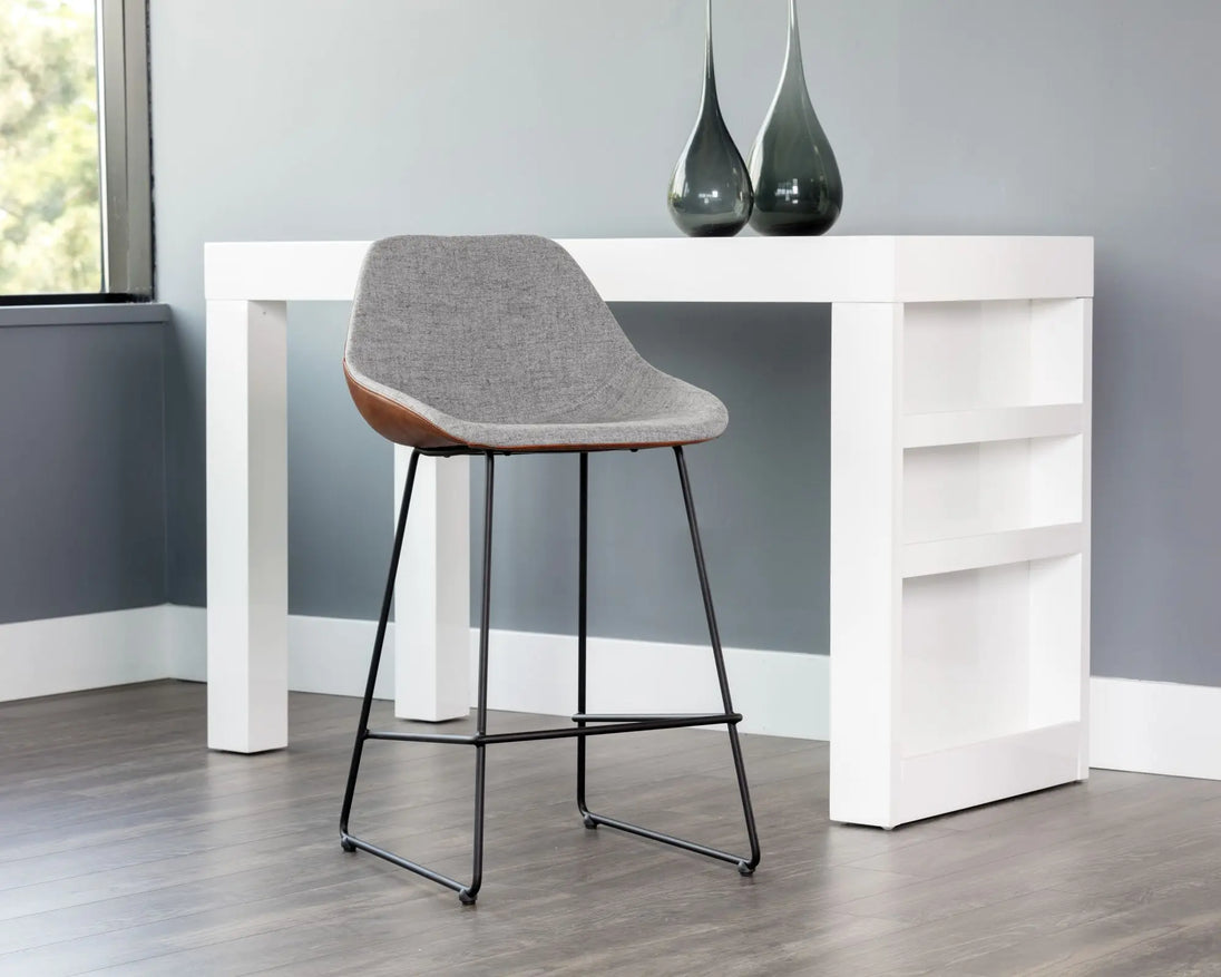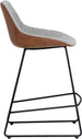 This counter stool exudes masculine charm. Features a sculpted two toned seat in november grey fabric with a cinnamon brown faux leather exterior. Tapered black steel legs create a bright and airy look. Also available with a november grey fabric seat and nightfall black faux leather exterior. Suitable for various dining, kitchen and bar spaces of all sizes. Handle With Care: This design has been crafted with faux leather. Faux leather is manufactured to reflect the natural characteristics of leather; as such, colour variations, markings, wrinkles, grooves, and light scratches are appreciated characteristics. No two pieces will be alike. Visit our Product Care page for more information on how to ensure the lasting beauty of this piece.