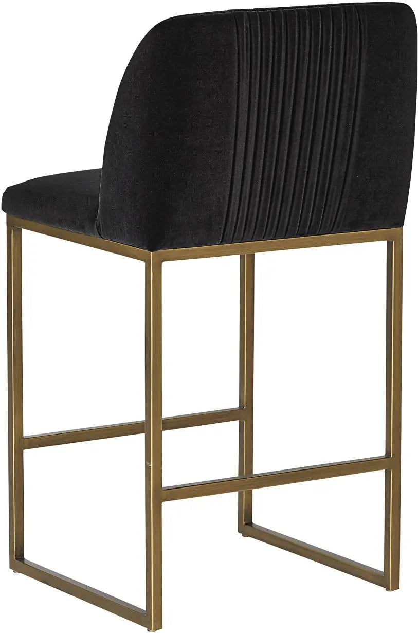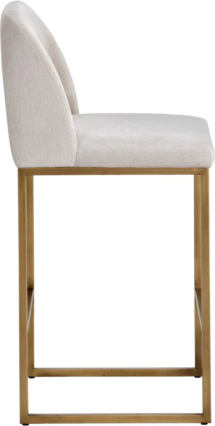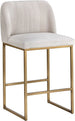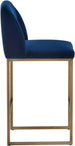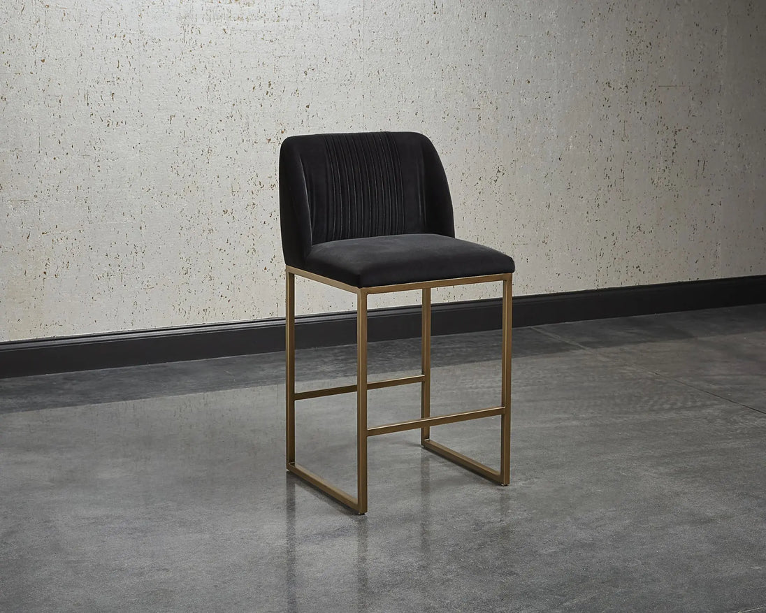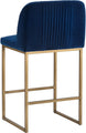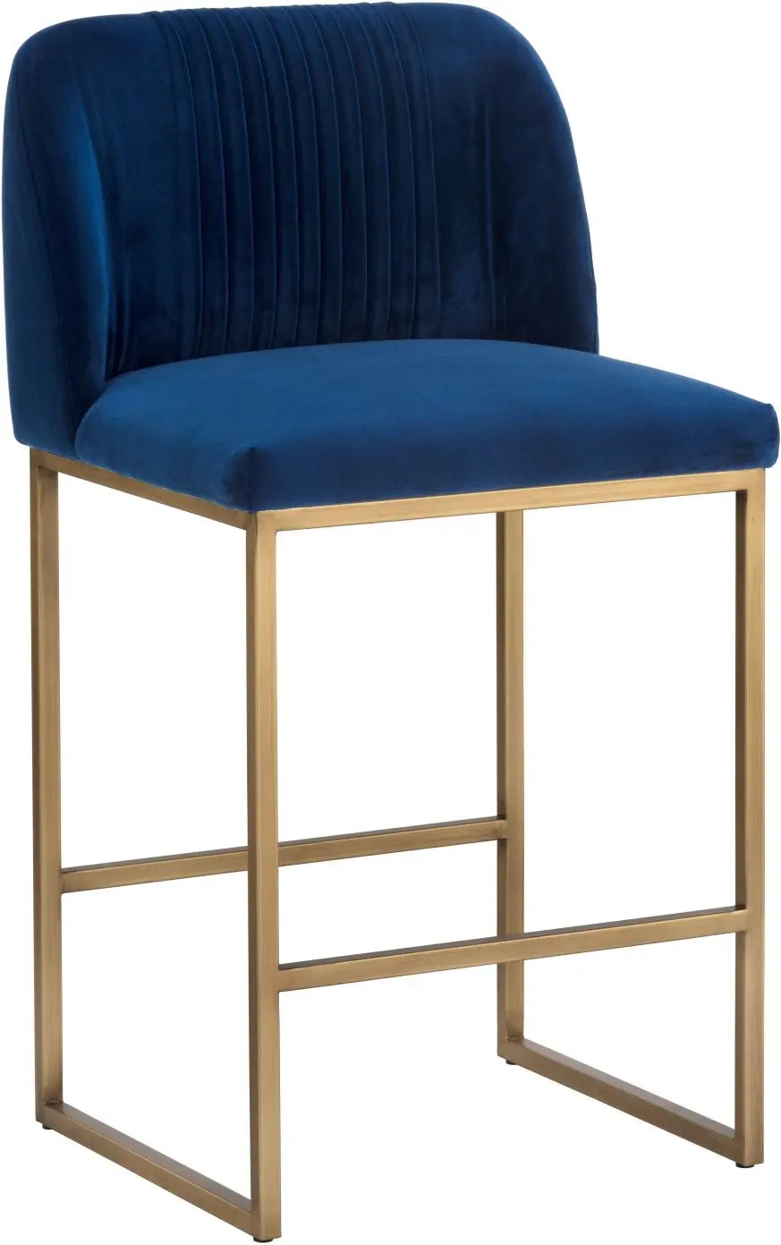 A modern counter stool that offers style and comfort. Features delicate ruching on the rounded seatback and exposed antique brass legs. Stocked in sapphire blue, shadow grey fabric and polo club muslin performance fabric. Performance fabric is moisture repellent, stain resistant and easy to clean. Suitable for various dining, kitchen and bar spaces of all sizes.