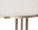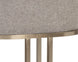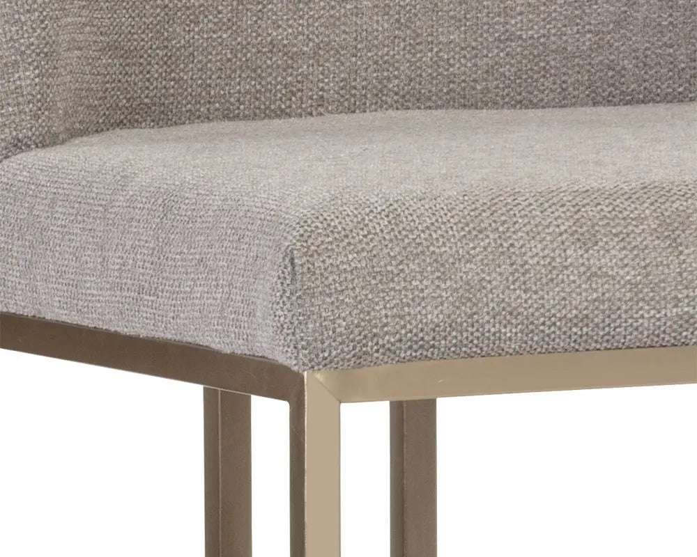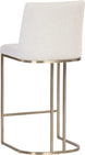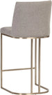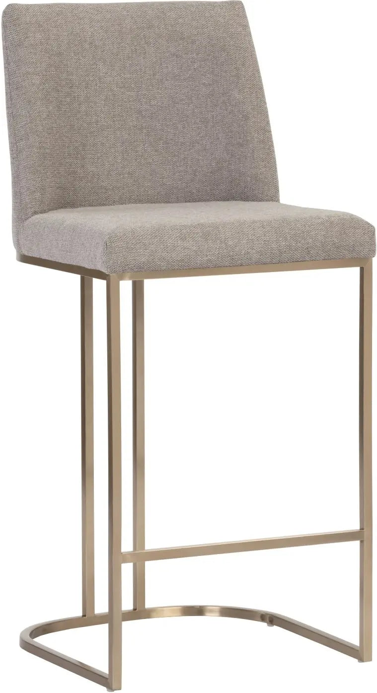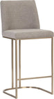 An elegant cantilever counter stool designed with soft, textured belfast oatmeal fabric and an exposed antique brass stainless steel frame.