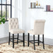 The Stella Counter Stool is sure to be a sophisticated and stylish addition to your dining space. This set includes two elegant chairs in a sleek beige finish, designed to elevate your dining experience. Crafted with utmost attention to detail, these chairs feature a luxurious 100% polyester fabric cover that not only feels soft to the touch but also adds a touch of refinement to your decor. The use of high-quality rubber wood in the construction ensures durability and longevity, making these chairs a sound investment for your dining area. The classic design elements of button tufting and convenient footrests not only add an element of timeless charm but also provide extra comfort and support during those long dinners or gatherings with friends and family. Underneath the fabric cover, you'll find a robust string and webbing seat structure, ensuring that these chairs provide a sturdy and comfortable seating experience, cushioned with 20 kg density foam. Sink into the plush comfort as you enjoy your meals or engage in lively conversations around the dining table.
