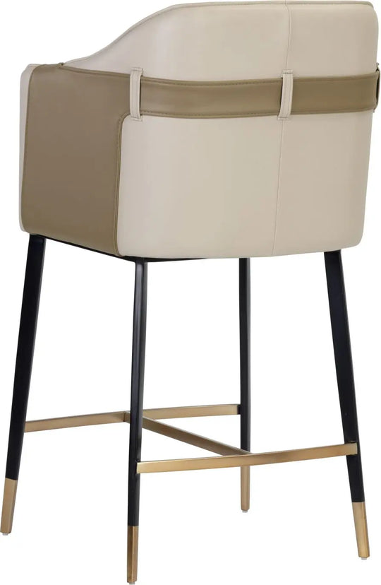 A unique barrel back counter stool upholstered in supple napa beige faux leather and accented with a contrasting exterior in napa tan faux leather. Finished with black steel legs and copper foot caps. Suitable for residential...Sale price $1,505.00Regular price $2,007.00Sale price $1,505.00Regular price $2,007.00 -