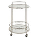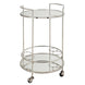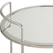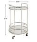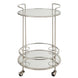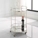 The Spritz Bar Cart rolls wherever the party goes! The metal cart is finished in polished chrome with dual mirrored shelves for optimal storage and display. The petite round frame sits atop rolling casters, enabling easy placement in any living or dining space.