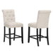 The Stella Counter Stool is sure to be a sophisticated and stylish addition to your dining space. This set includes two elegant chairs in a sleek beige finish, designed to elevate your dining experience. Crafted with utmost attention to detail, these chairs feature a luxurious 100% polyester fabric cover that not only feels soft to the touch but also adds a touch of refinement to your decor. The use of high-quality rubber wood in the construction ensures durability and longevity, making these chairs a sound investment for your dining area. The classic design elements of button tufting and convenient footrests not only add an element of timeless charm but also provide extra comfort and support during those long dinners or gatherings with friends and family. Underneath the fabric cover, you'll find a robust string and webbing seat structure, ensuring that these chairs provide a sturdy and comfortable seating experience, cushioned with 20 kg density foam. Sink into the plush comfort as you enjoy your meals or engage in lively conversations around the dining table.