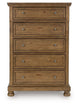 - 5 smooth-gliding drawers with fully finished interiors, English dovetail construction and heavy-duty ball-bearing side glides (top drawer felt lined)