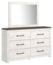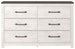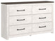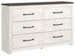White rustic finish with replicated cedar grain accented with rustic gray planked replicated oak grain with authentic touch. Cases feature a framed front and pilasters. Contemporary handles in a dark pewter color finish. Side roller glides for smooth operating drawers. Drawer interiors lined with a replicated linen design for a clean, finished look. Queen (71) and king (72) headboards can attach to a bolt-on metal bed frame B100-31 or B100-66 respectively. Lighted bed option (54,56,57,58,98,99) with an abstract design. Queen and king panel headboards (57,58) feature decorative modern sconce lights in a matte black finish with champagne colored accents. Safety is a top priority, clothing storage units are designed to meet the most current standard for stability, ASTM F 2057 (ASTM International). Drawers extend out to accommodate maximum access to drawer interior while maintaining safety.