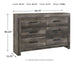 Rustic gray planked replicated oak grain with authentic touch. Large scaled dark colored hooded pull. Sticks across headboard give a thick planked look. Side roller glides for smooth operating drawers. Cases feature a framed front and pilasters. Large drawers provide ample storage space. Slim profile dual USB charger located on the back of the night stand tops. Queen (67) and king (68) poster headboards feature an upholstered panel with horizontal channel details. King poster bed requires the use of the king poster headboard posts (62). Large scaled bed option (54,56,57,58) with a cross-buck design. The queen (98) rails work with both (64,54) footboards. The king (99) rails work with both (66, 56) footboards. B440-48 has a sliding door over open shelves and five drawers of storage. Headboard and footboard option (53,55) with a cross-buck design. Safety is a top priority, clothing storage units are designed to meet the most current standard for stability, ASTM F 2057 (ASTM International). Drawers extend out to accommodate maximum access to drawer interior while maintaining safety.