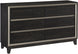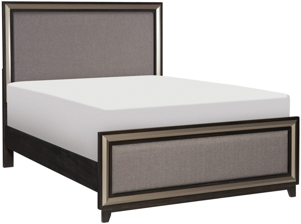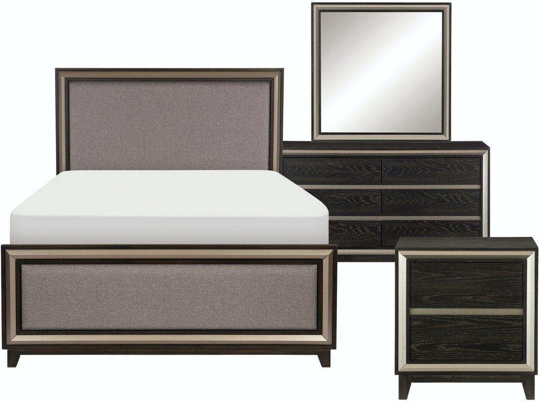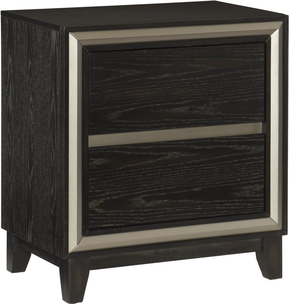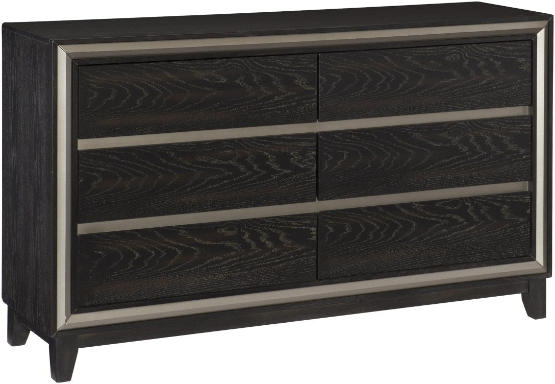 Product Description: The Grant Collection features a streamlined profile and visual complementing contrast, with the resulting design being a perfect fit for your modern home. An ebony finish is utilized over oak veneer, highlighting the distinct grain, with silver finished banding defining the fronts of the Queen headboard and footboard.