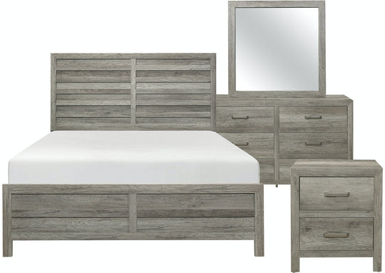 SALE               Mandan Queen Bed 4pc Set - Gray Includes: Queen Bed / Dresser / Mirror / X1 Night Stand Product Description: The modern lines of the Mandan Collection are blended with transitional aesthetic to create a unique offering for your bedroom. Utilizing printed faux wood...Sale price $2,299.00Regular price $2,799.00Sale price $2,299.00Regular price $2,799.00