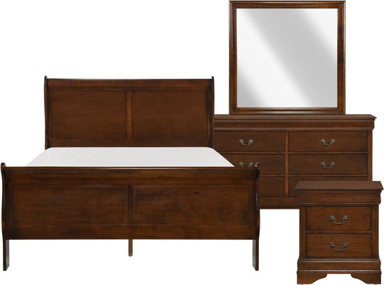 SALE                     Mayville Queen Bed 6pc Set - Cherry Includes: Queen Bed (Headboard,Footboard,Rails) / Dresser / Mirror / X1 Night Stand Product Description: Traditional in design and modest in scale, the elegant Mayville Collection takes its design inspiration from the classic Louis Philippe styling. Burnished brown...Sale price $1,099.00Regular price $1,999.00Sale price $1,099.00Regular price $1,999.00