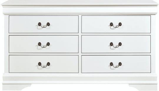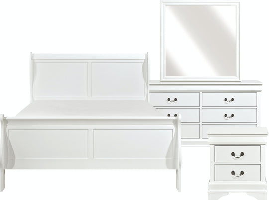 SALE               Mayville Queen Bed 6pc Set - White Includes: Queen Bed (Headboard, Footboard,Rails) / Dresser / Mirror / X1 Night Stand Product Description: Traditional in design and modest in scale, the elegant Mayville Collection takes its design inspiration from the classic Louis Philippe styling. Burnished white...Sale price $1,099.00Regular price $1,999.00Sale price $1,099.00Regular price $1,999.00