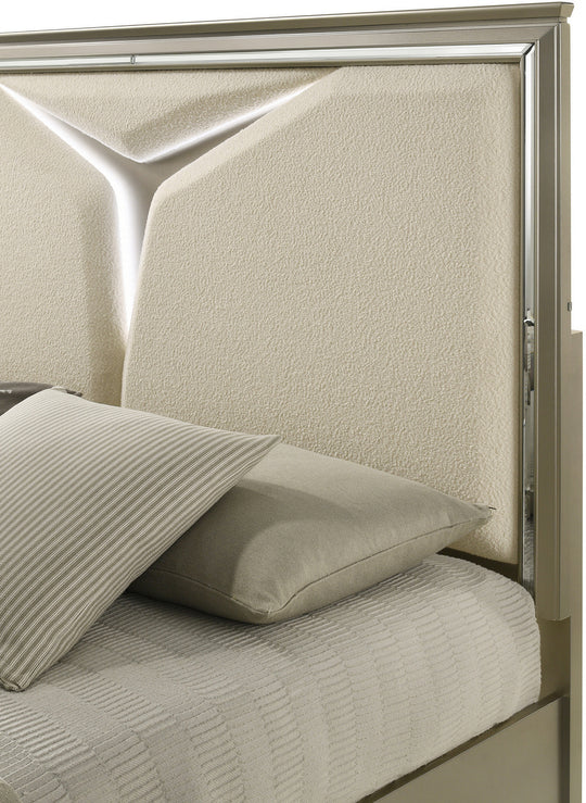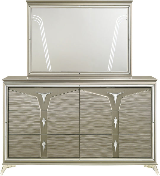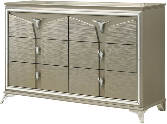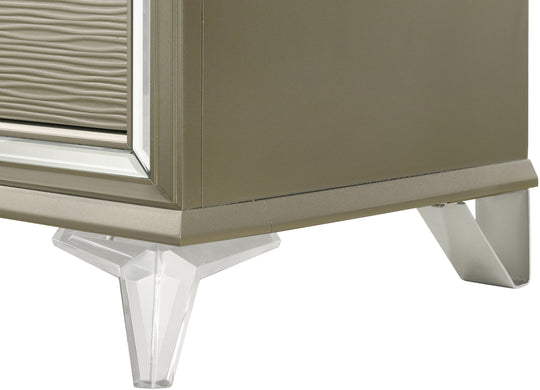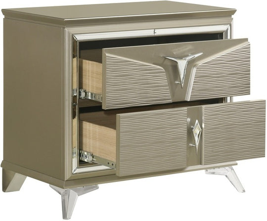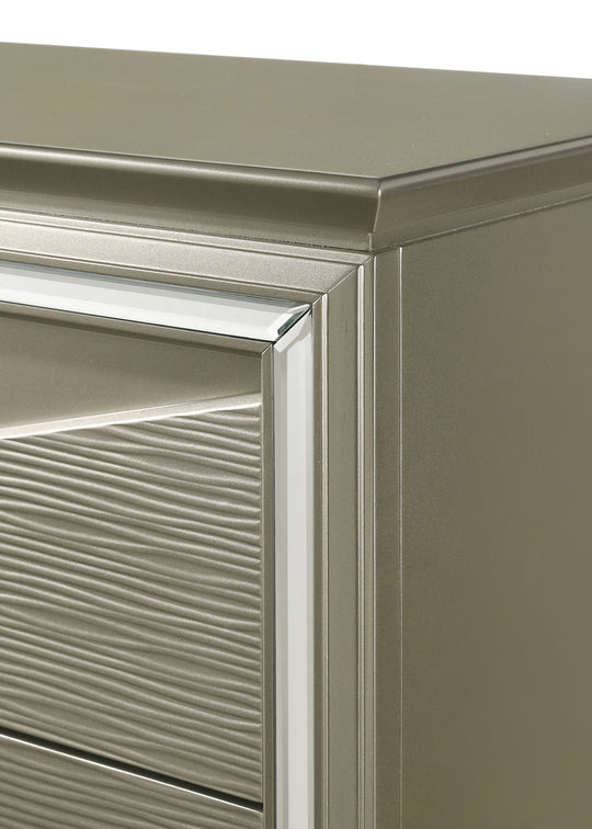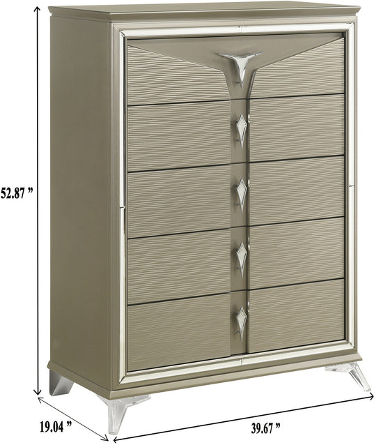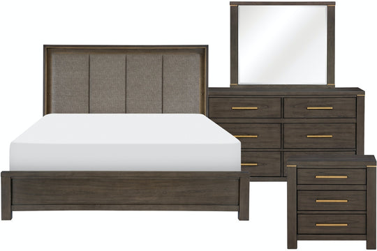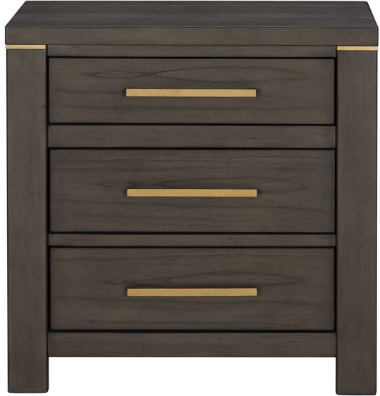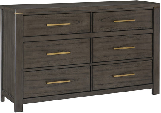 Product Description: The elegant modern profile of the Scarlett Collection will be the perfect addition to your bedroom. Cashew solid wood and mindy veneer is finished in a brownish gray with gold finished hardware and accent banding...Sale price $3,399.00Regular price $3,999.00Sale price $3,399.00Regular price $3,999.00