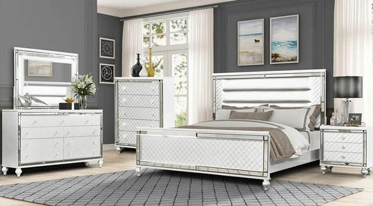 SALE     Veronika Park Bedroom Collection - White Veronika Bedroom Set Brings A Whole Feel To The Bedroom With A Unique Modern Charcoal Grey Finish And Champagne Leather Insert Headboard With LED Lights. Color - White Product Features - Solid Wood, Wood veneers, and others-...Sale price From $1,899.00Regular price $2,799.00Sale price From $1,899.00Regular price $2,799.00