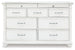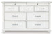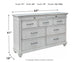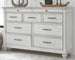 Made with veneers and select hardwood solids in a distressed whitewashed finish. Design features updated traditional styling with generously scaled moulding details. Dresser features 7 full sized drawers with 2 small scaled accessory drawers. Ball bearing side glides. Hardware has a transitional aesthetic and is finished in a dark gray pewter color. Mansion style headboard options feature a picture framed panel or inset tufted taupe upholstery cushion. Optional storage bench footboard.