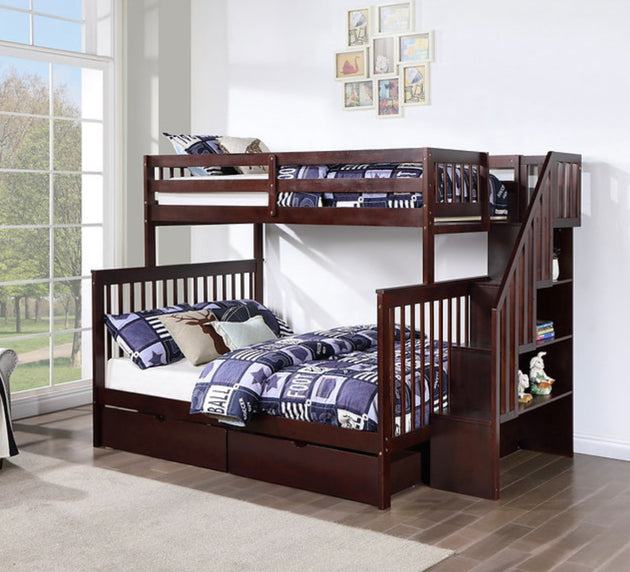 Wendy B-1850 Espresso Bunk Bed w/ Stairs & Storage Shelves (Twin/Full)