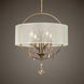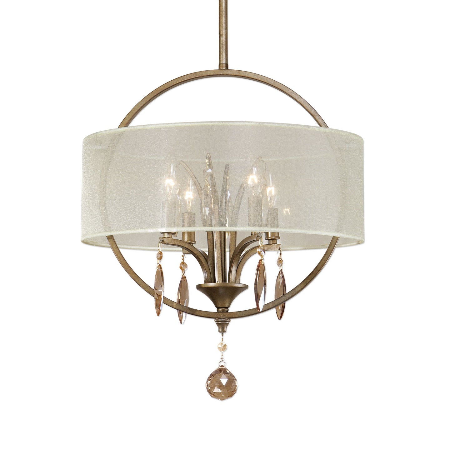 Burnished Gold Metal With Golden Teak Crystal Leaves And A Silken Champagne Sheer Fabric Shade. Includes 15' Wire, 3-12" Stems And 1-6" Stem For Adjustable Installation.Product Features