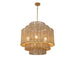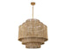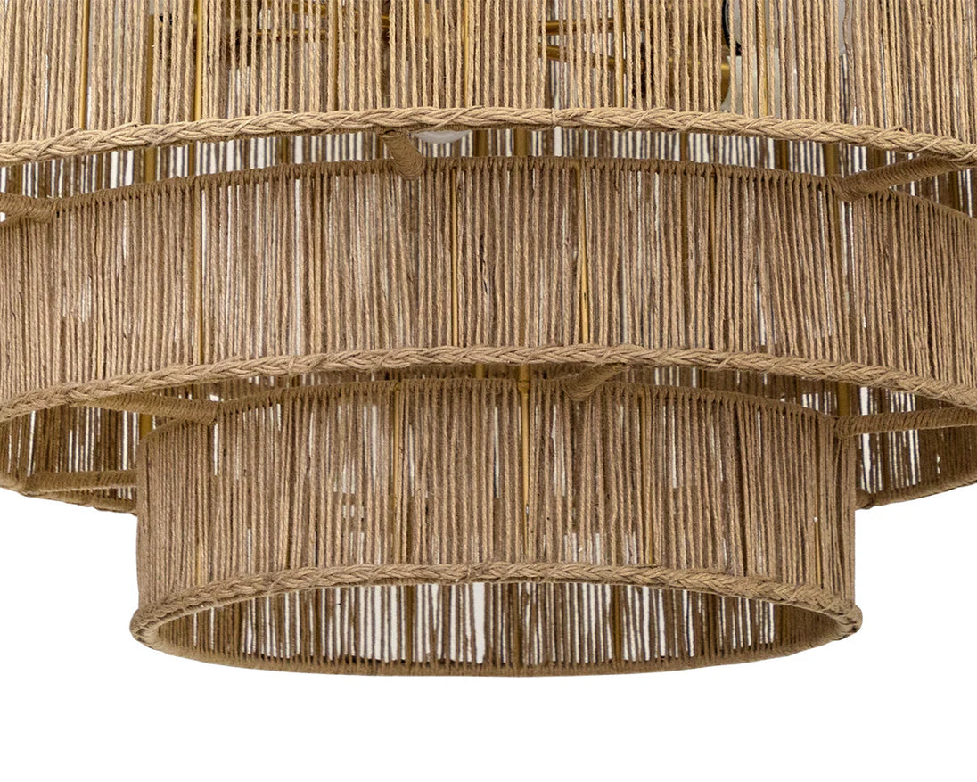 Each of the five tiers of the Alyssa Chandelier is carefully handwoven with Natural jute, highlighting its enduring beauty. Suspended from an antique brass rod, this chandelier brings a light airy look to any room it is placed in.
