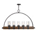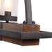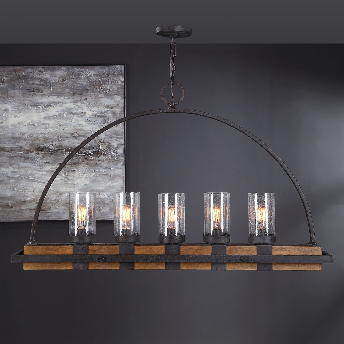 Heavy Gauge Real Wood Linear Body, Finished In A Mid-tone, Featuring Clear Seeded Glass Shades. A Nod To Industrial Design Is Found In The Iron Wrapped Frame, And Top Arch. The Metal Work Is In A Deep Weathered Bronze Finish With A Slight Texture And Black Antiquing. With 5-100 Watt Max, Edison Sockets And Includes 5-60 Watt Antique Style, BT58 Amber Bulbs. Supplied With 20' Wire And 7' Chain For Adjustable Installation.Product Features