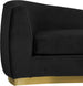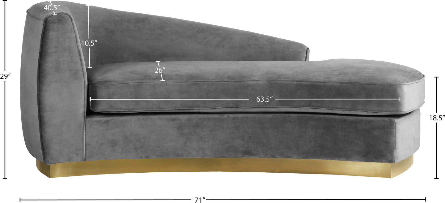 The perfect mix of black velvet and gold stainless steel comes to life in your space with this Julian Black Velvet Chaise. This bold black velvet chaise comes upholstered in rich, sumptuous-to-the-touch velvet to make a fashionable statement in your space. The curved back design lends it a modish touch, and the gold stainless steel trim around its base adds to its glitzy appeal. Stage this chaise alone or with other pieces in the Julian collection.