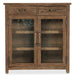Reimagining an historical design with a fresh take on finish, function and form, the Americana Pie Chest has two wood-framed seeded glass doors with magnetic catches and a light in the door area. Crafted of Oak Veneer, it is finished in the gentle warm Honey tone with distressing for authenticity. Measuring 40 inches high by 38 inches wide, it has two self-closing drawers and two adjustable wood framed tempered glass shelves with plate grooves. Metal alloy oval and bar pulls in an antique bronze finish.