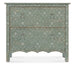 In a classic, charming design with a nostalgic flair, the Americana Two-Drawer Accent Chest has a scalloped-bottom shape and is finished in a soft Antique Green with distressing and rub-through over Oak Veneers. A white scroll pattern covers the exterior, and the interior has a Honey finish. Metal alloy tear-drop pulls in an antique pewter finish have white hang-up accent. Two self-closing drawers.