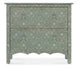 - Finish: Antique green finish with distressing and rub-through. The accent chest also features a white finished scroll pattern. Metal alloy tear-drop pulls in an antique pewter finish with white hang-up.