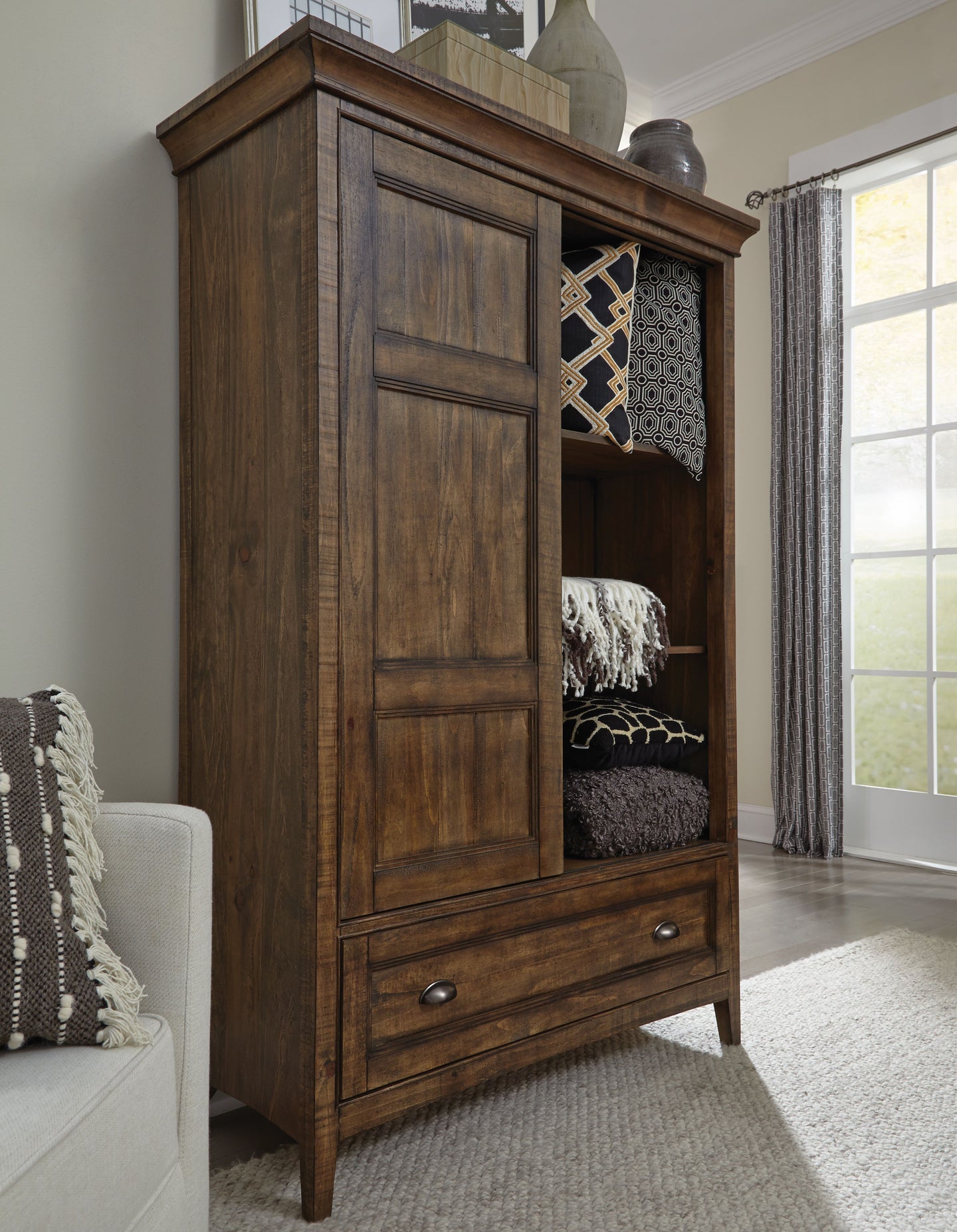 - 1 wood sliding door on the right.