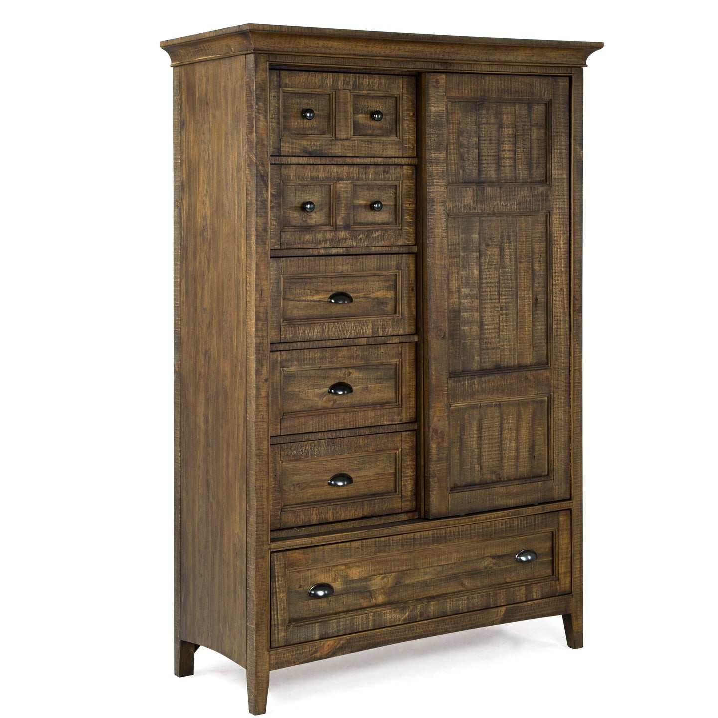 Retreat to Bay Creek and enjoy a yummy Toasted Nutmeg finish on Pine veneers and solids accented by aged bronze hardware. Whether in a second home, a casual city abode or in the suburbs, this collection offers beaded, framed panel drawers over straight shaker inspired legs and plenty of drawers to stow your togs. The rectangular panel bed offers a tailored respite as well a storage rails alternative.