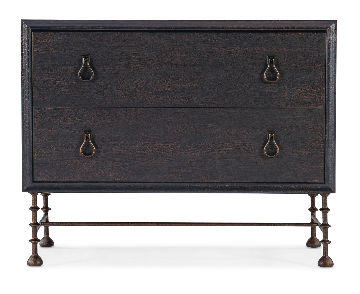 Warm and rustic, the Big Sky Bachelor’s Chest has a vintage design pairing a case crafted of rustic Pecky Hickory Veneers in the dark Charred Timber finish with turned metal legs and stretchers. Featuring two drawers, the top drawer has a removable felt liner and the bottom drawer is cedar-lined. There’s a power supply and a cord clip on the back.