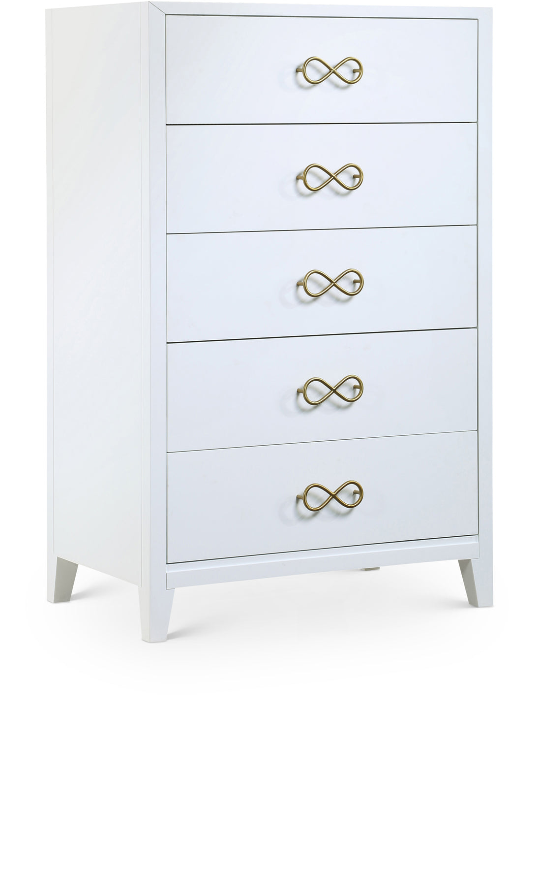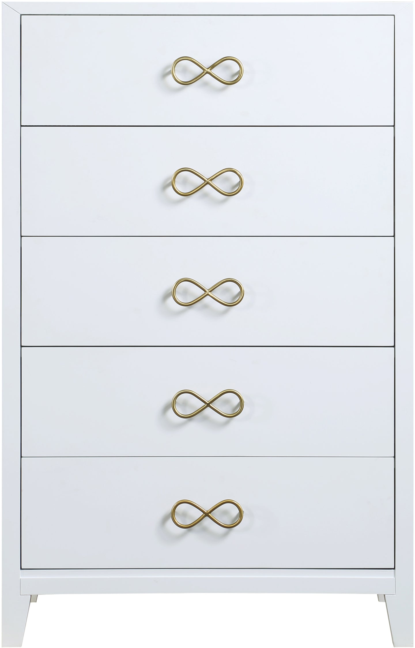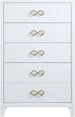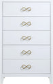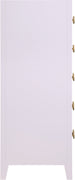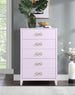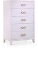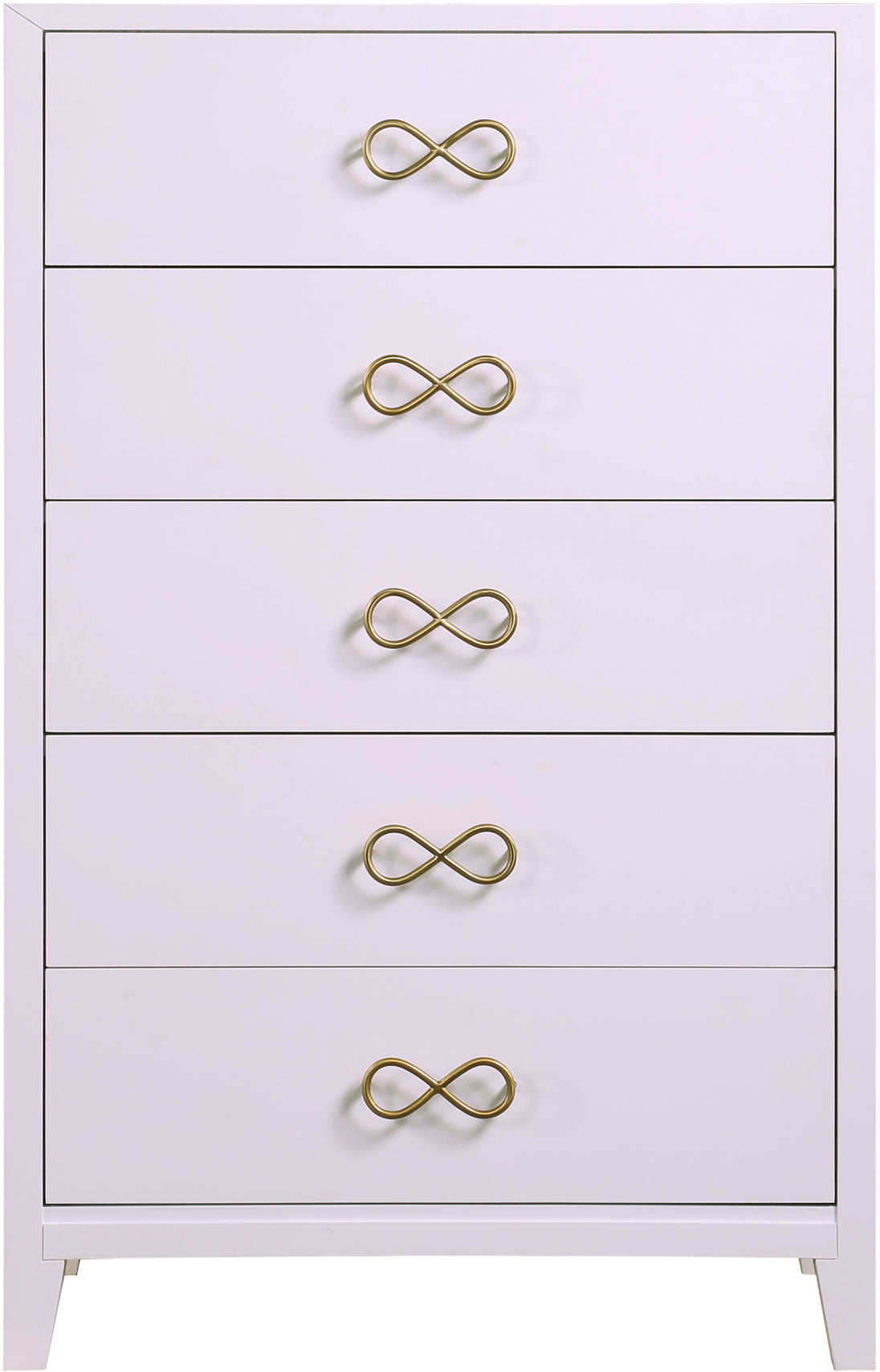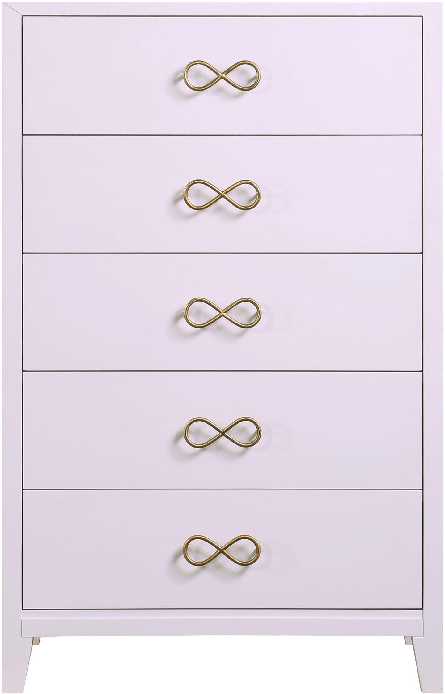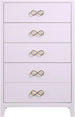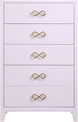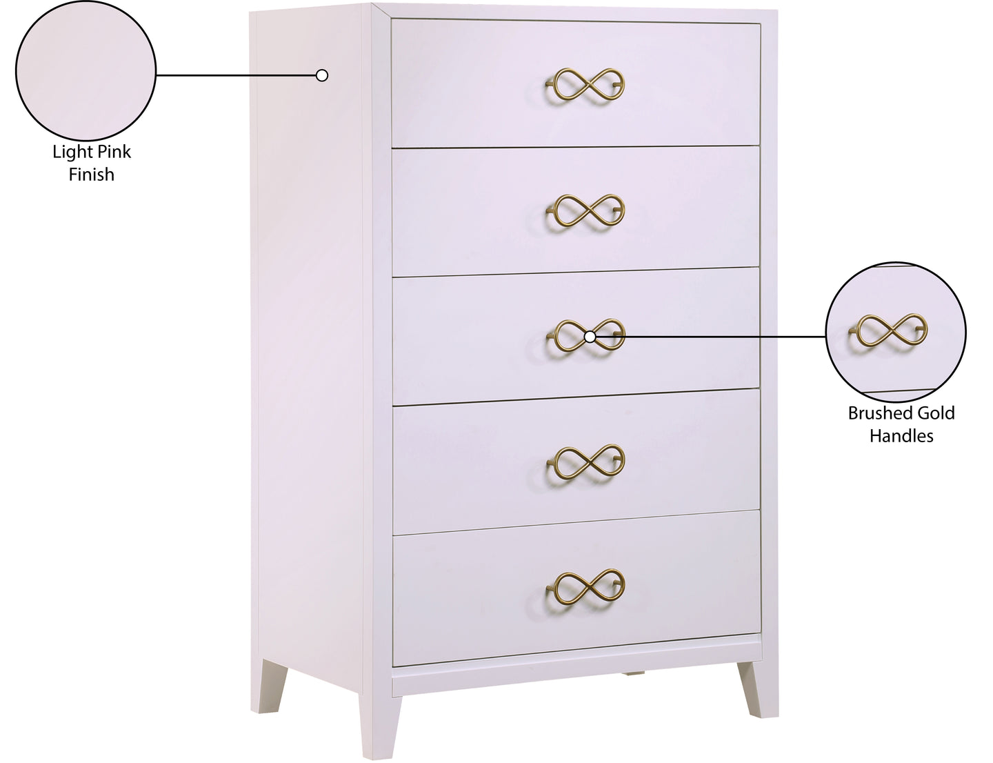 Bring unique elegance to your bedroom with this Bowtie pink/gold chest from Meridian Furniture. This chest features five drawers, providing you with plenty of storage space for clothes, linens, or miscellaneous objects. Its light pink color adds a touch of femininity to your living space, and its brushed gold bow tie handles complement your existing decor. Its flat top is perfect for placing a lamp, framed picture, books, bric-a-brac, and more.