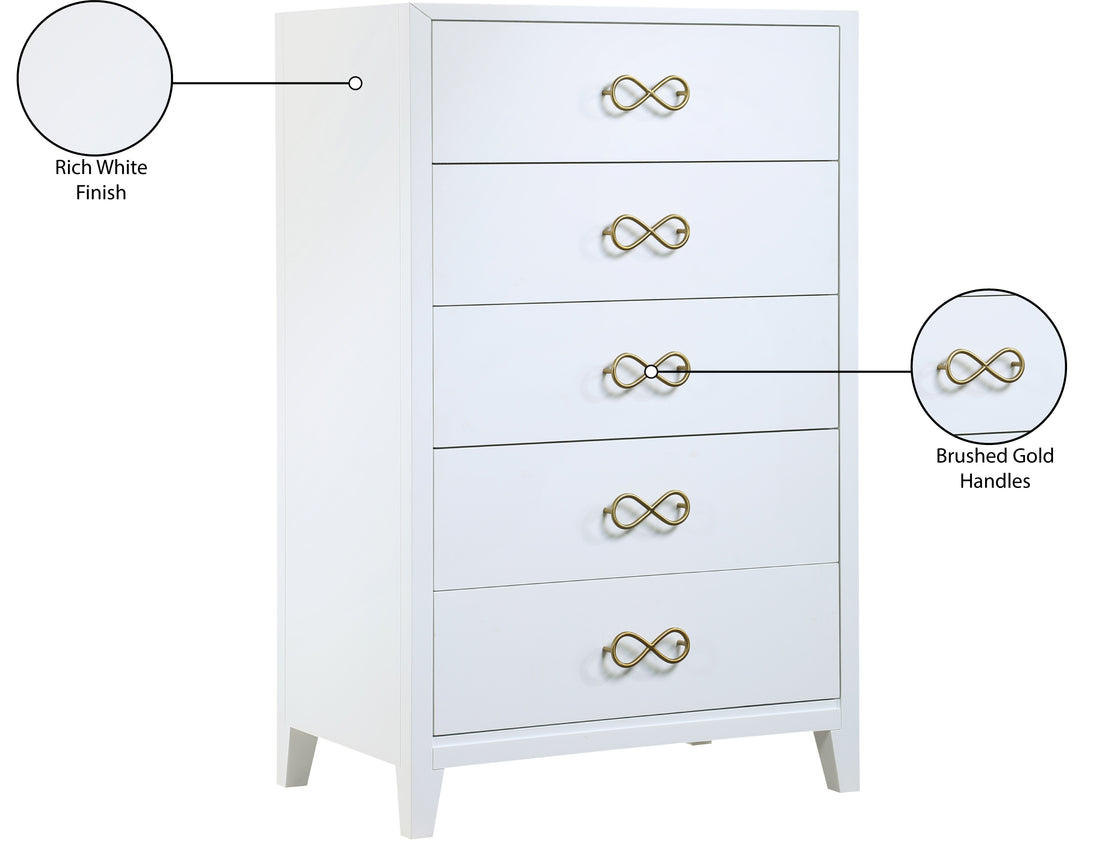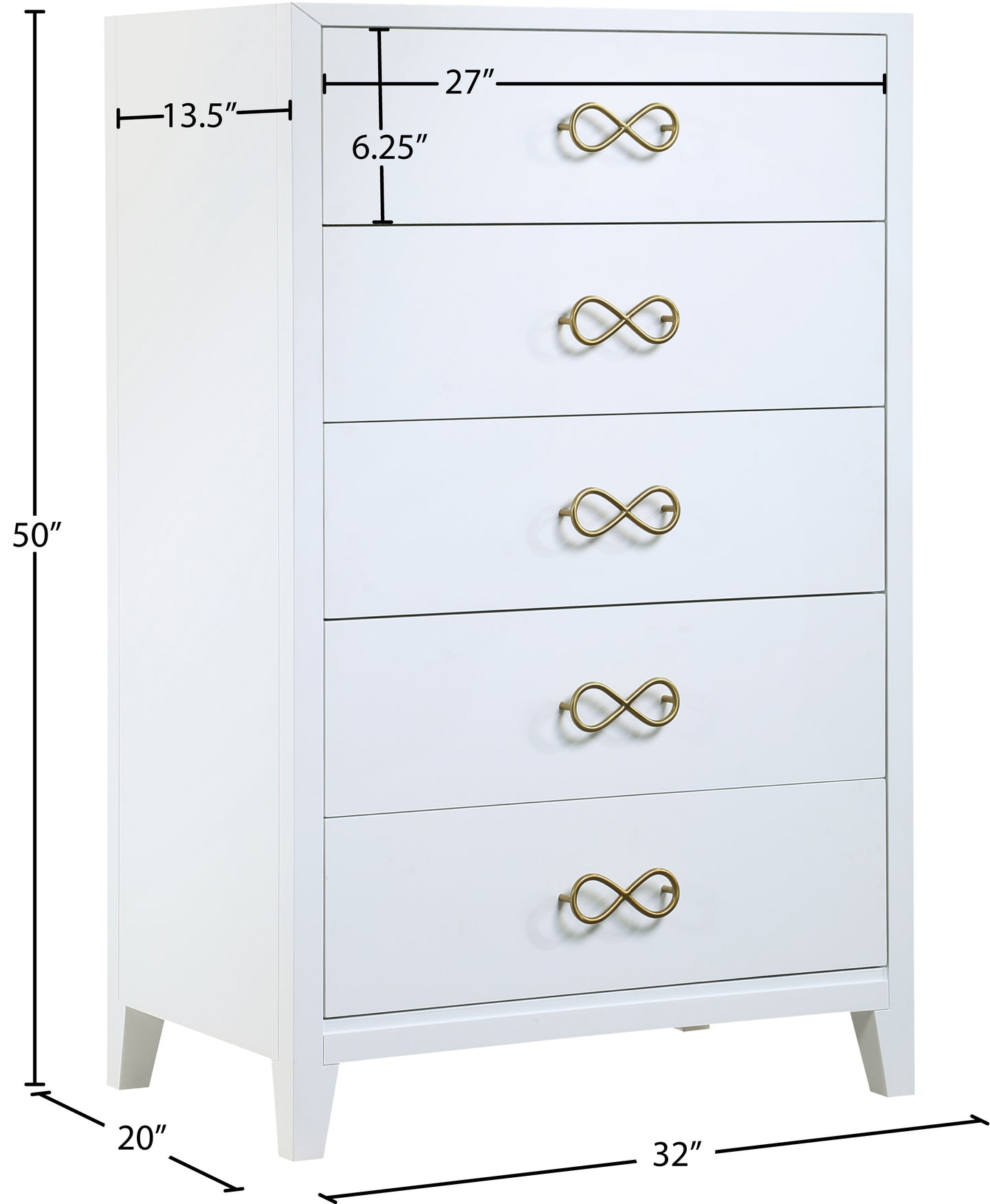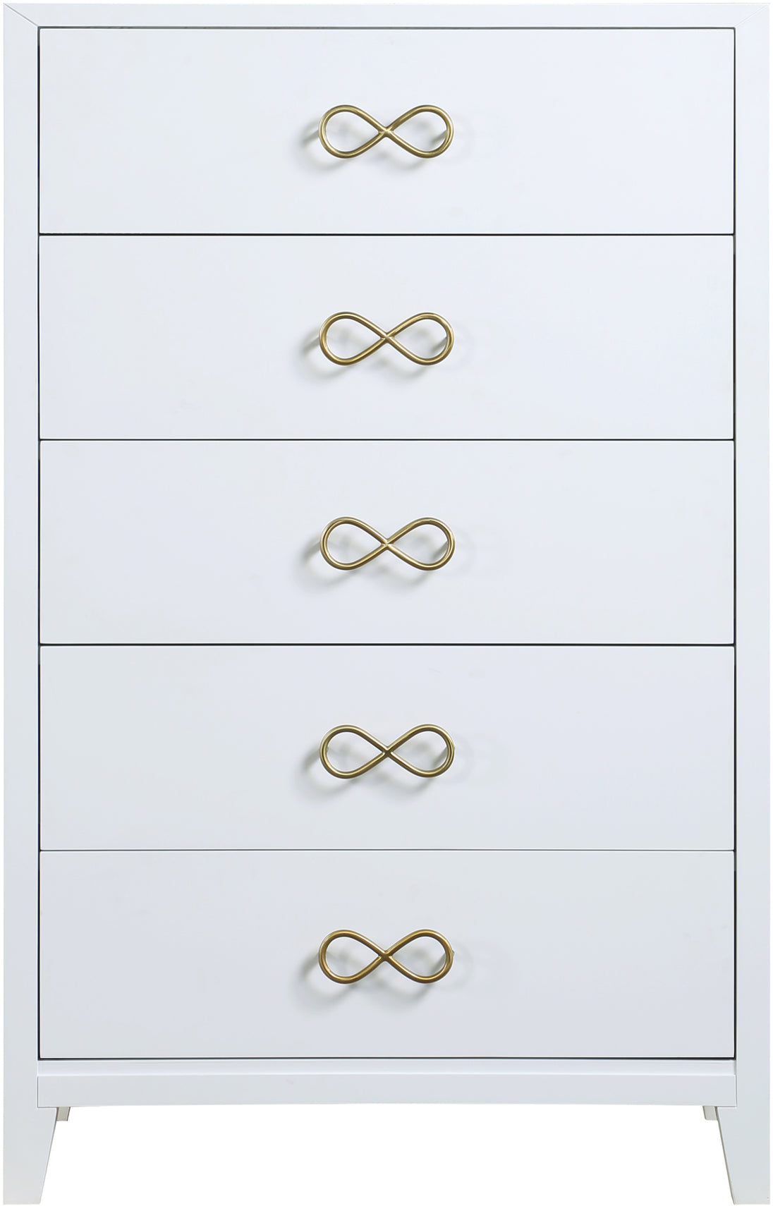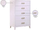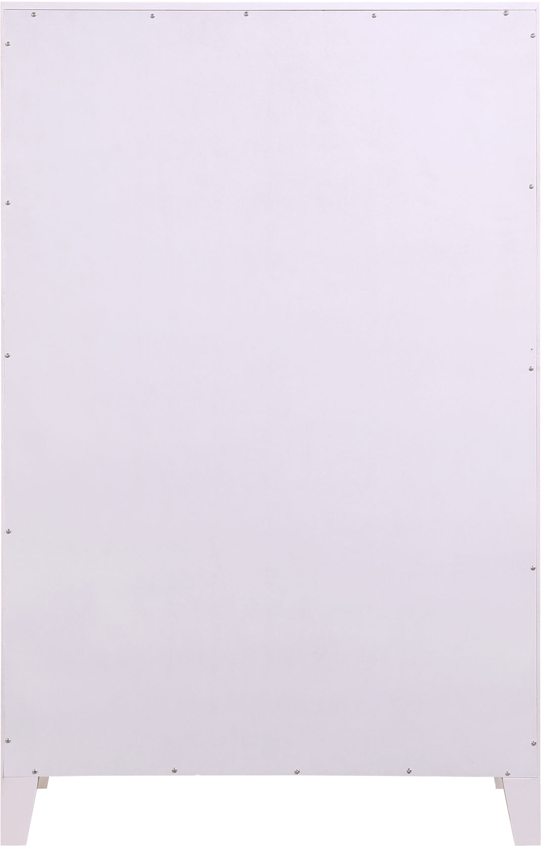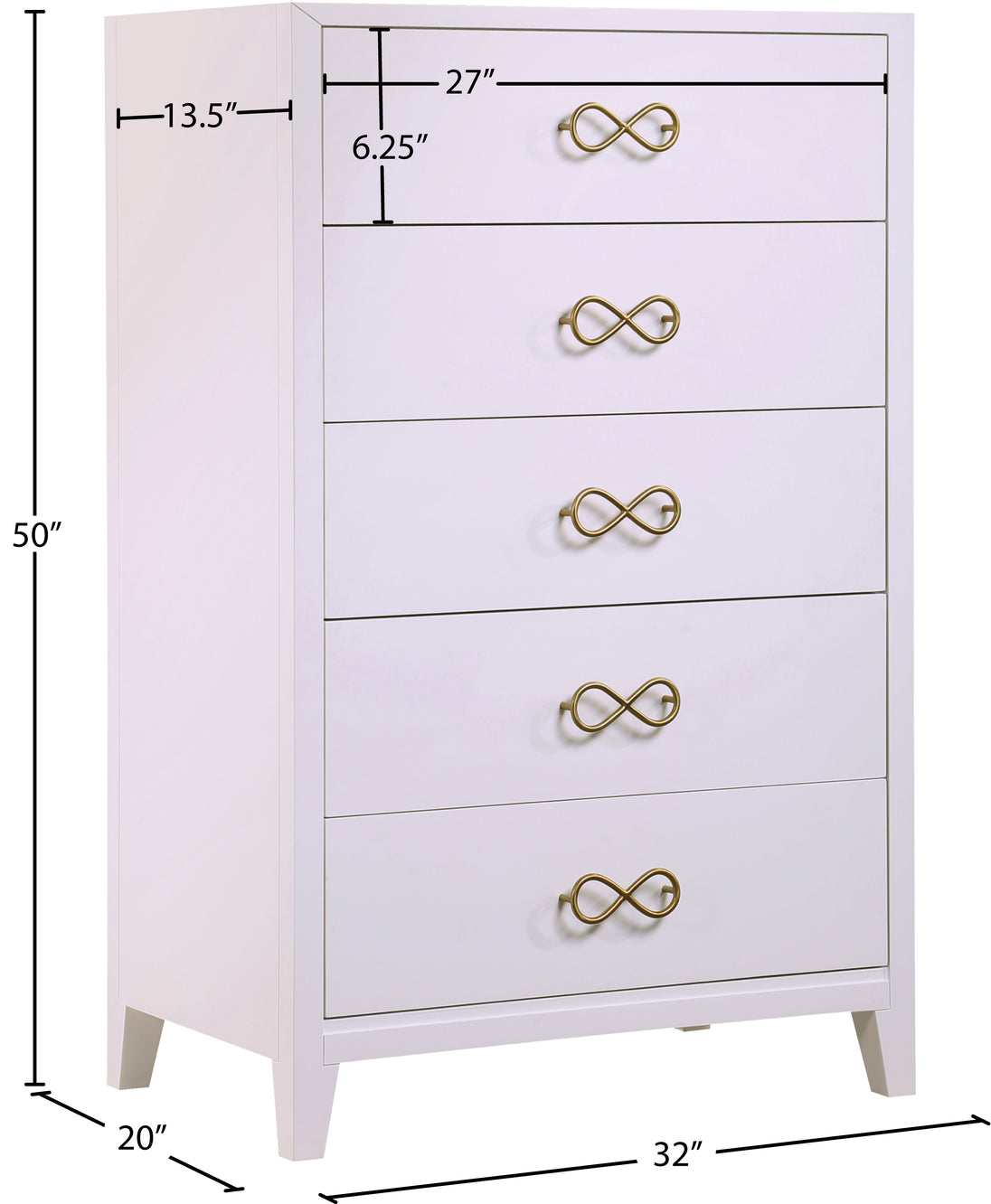 Bring unique elegance to your bedroom with this Bowtie pink/gold chest from Meridian Furniture. This chest features five drawers, providing you with plenty of storage space for clothes, linens, or miscellaneous objects. Its light pink color adds a touch of femininity to your living space, and its brushed gold bow tie handles complement your existing decor. Its flat top is perfect for placing a lamp, framed picture, books, bric-a-brac, and more.