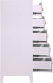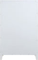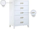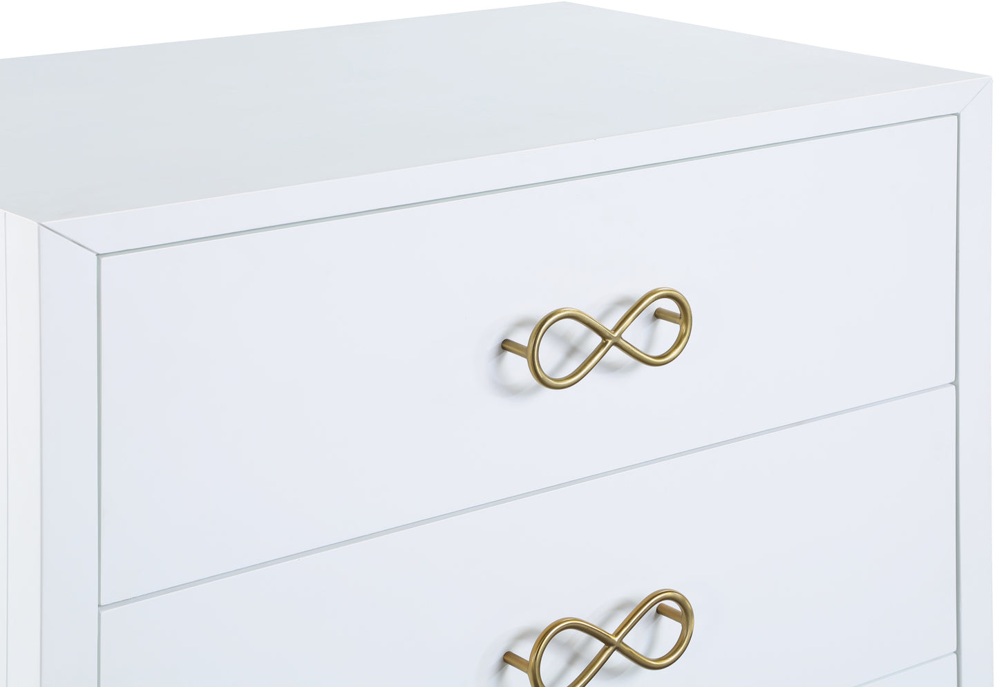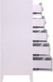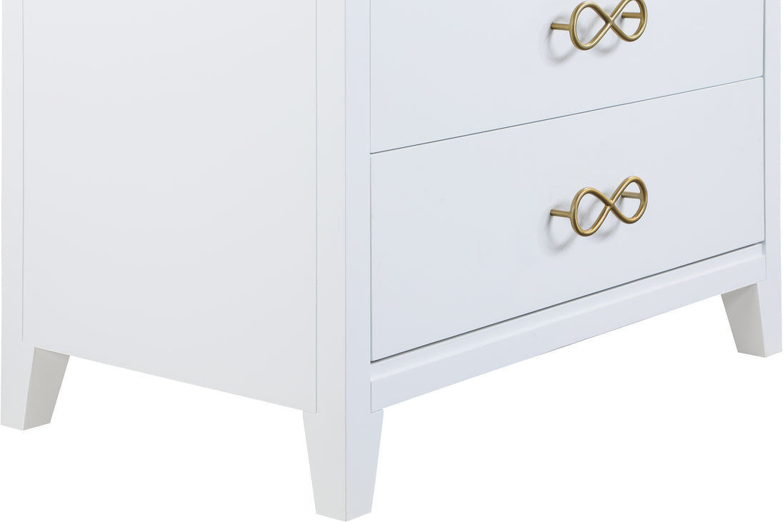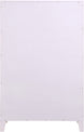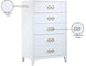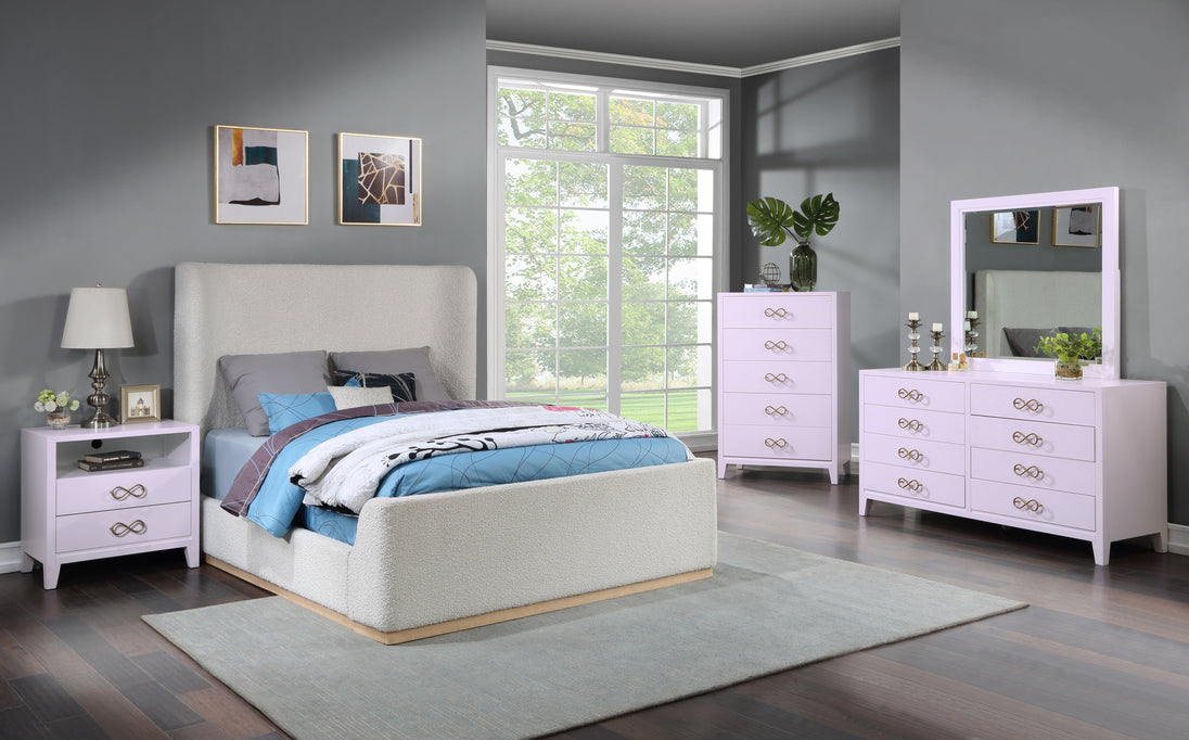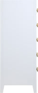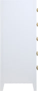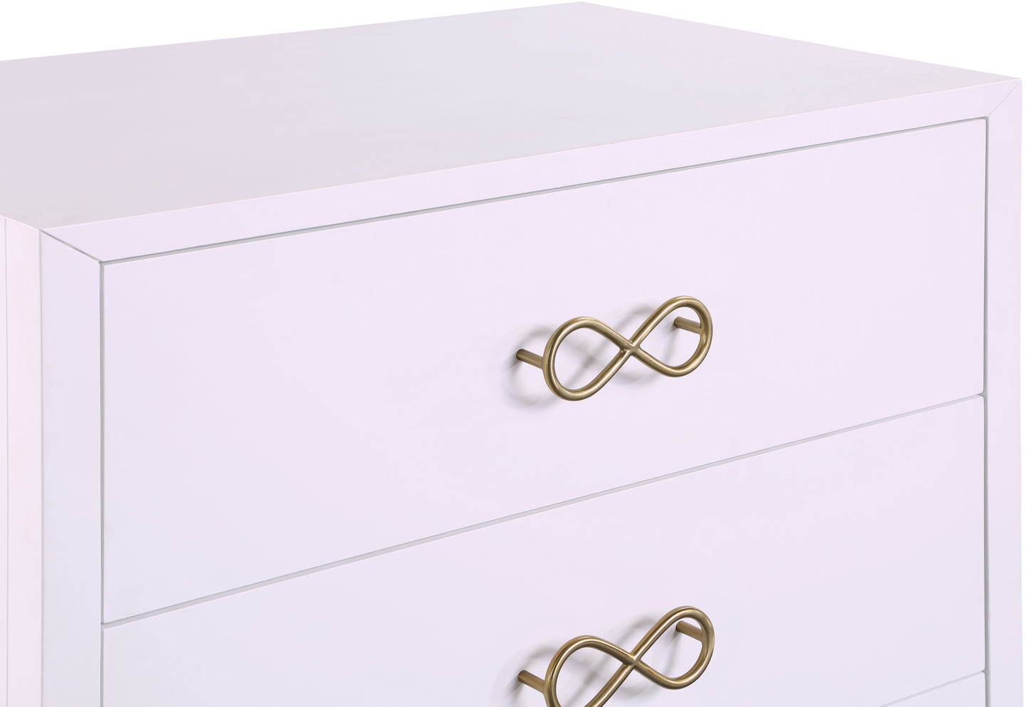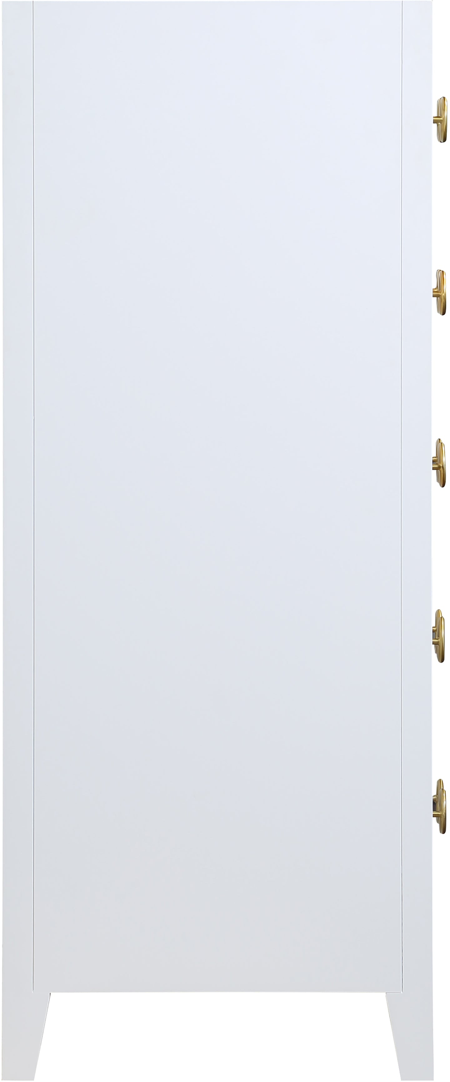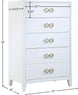 Bring unique elegance to your bedroom with this Bowtie pink/gold chest from Meridian Furniture. This chest features five drawers, providing you with plenty of storage space for clothes, linens, or miscellaneous objects. Its light pink color adds a touch of femininity to your living space, and its brushed gold bow tie handles complement your existing decor. Its flat top is perfect for placing a lamp, framed picture, books, bric-a-brac, and more.