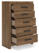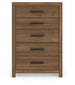 With its rich, warm finish over replicated wood grain, this casually cozy chest of drawers evokes the tranquil vibe you long for in your dream destination. Both functional and versatile, its five roomy drawers with large-scale handles offer easy access to hidden storage for cozy sweaters, casual tees and so much more.