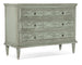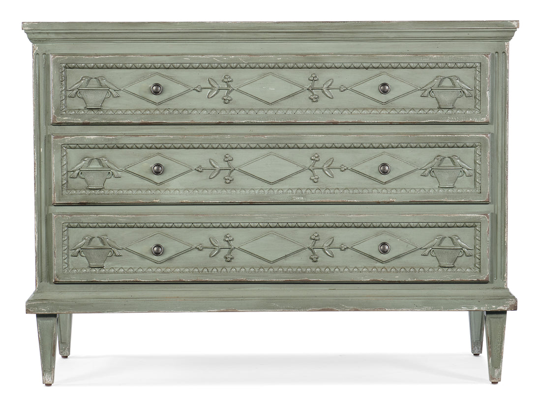 Capturing the vintage charm of the coastal South, the Charleston Three-Drawer Accent Chest has carved drawer fronts with bird, floral and diamond motifs and tapered legs. Featuring 3 self-closing drawers with drawer interiors to match the exterior, the chest is crafted of Maple Veneers and Resin and finished in Verdigris Green. Also known as "true Charleston green," Verdigris Green is the result of the natural patina formed when copper is exposed to air and seawater. This weathered green color represents years of Low Country heat and moisture degrading the pure pigment color, creating a truly venerable aesthetic. The round knobs are finished in an antique bronze color.