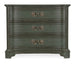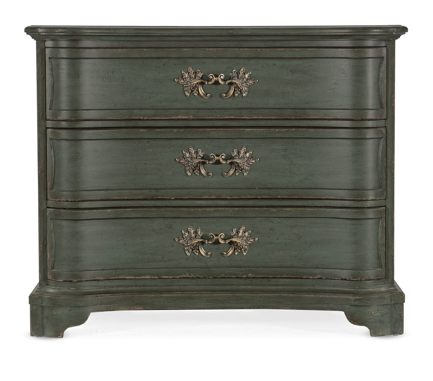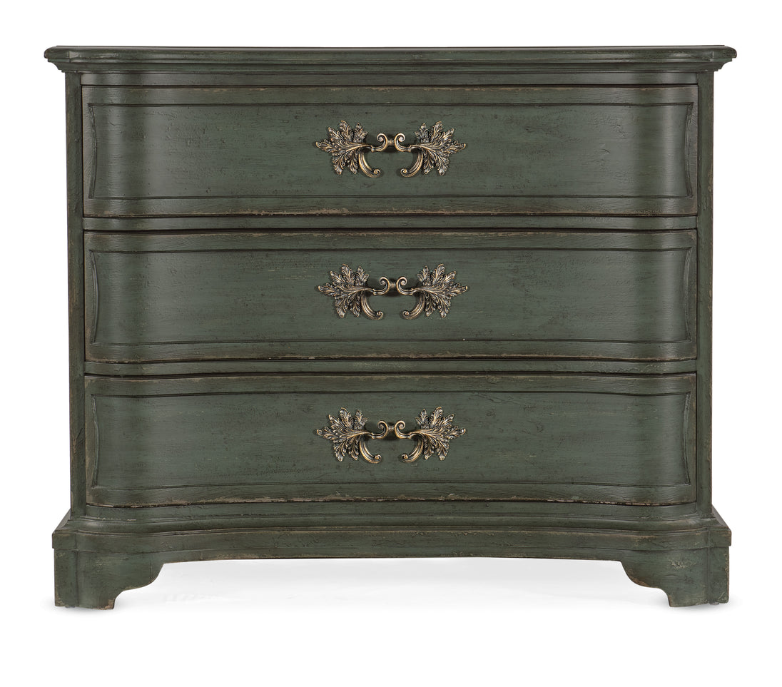Capturing the vintage charm of the coastal South and the tropical craftsmanship of the West Indies, the Charleston Three-Drawer Accent Chest has scalloped legs and dramatic decorative pulls in a carved leaf motif in an antique bronze color. Crafted of Maple Veneers, the chest is finished in Gullah Green, a deep teal-blue reminiscent of the mysterious waters within wetlands and marshes of the American South. The 3 self-closing drawers have an interior color matching the exterior.
