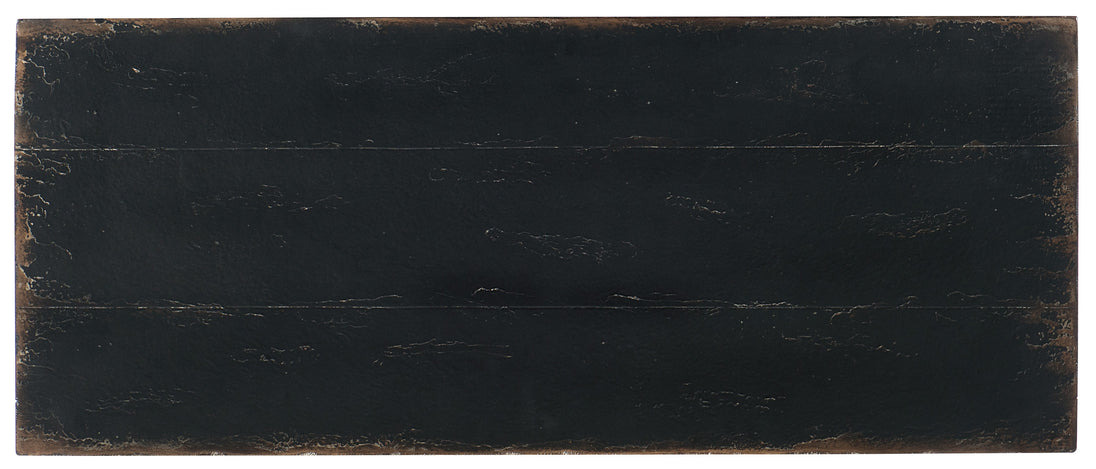 - Finish: Black finish. Distressing includes wormholes, rasping, multi-layer rub through and emulsion. Burnished brass hardware.