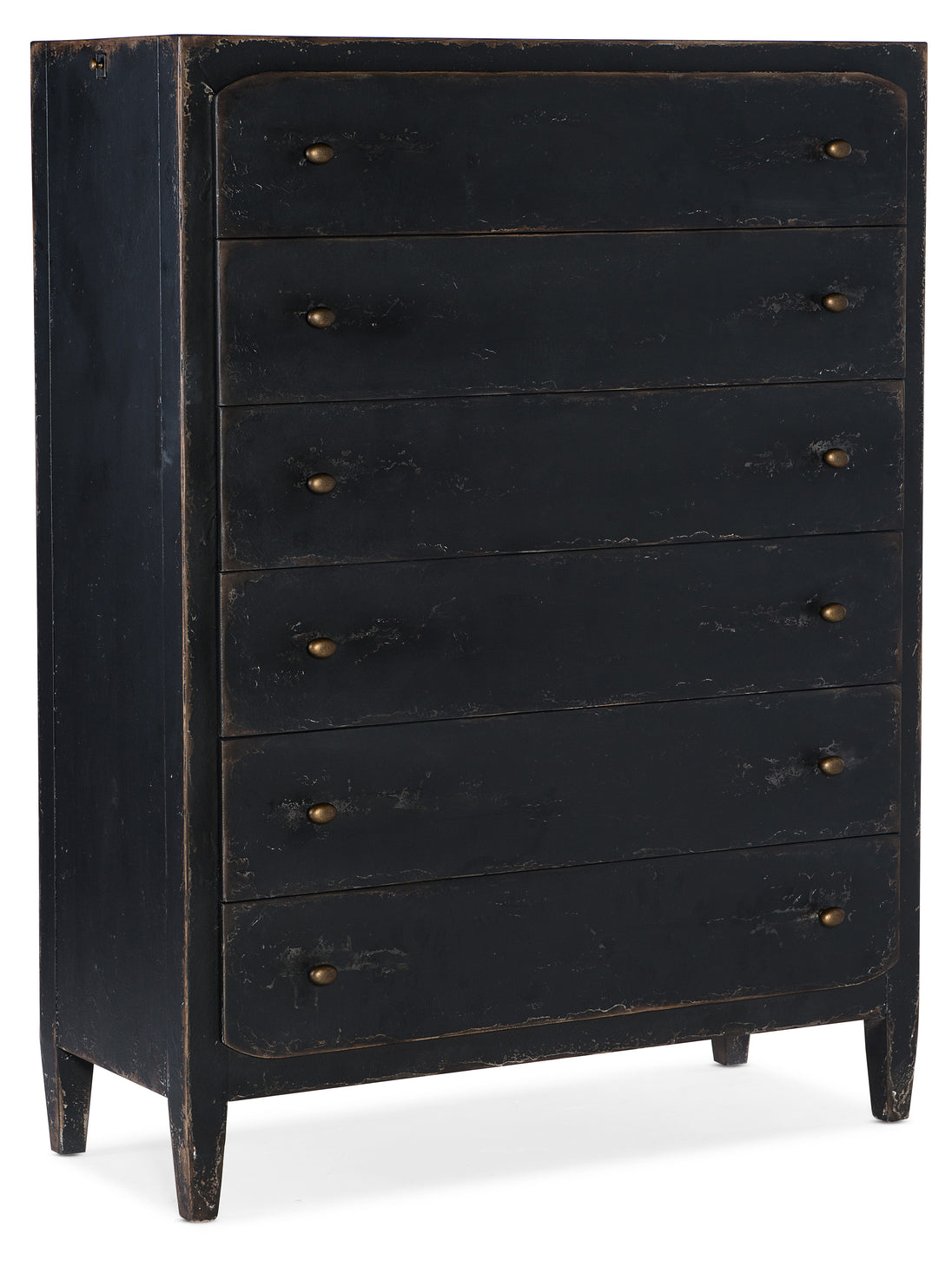 Inspired by European farmhouses, the 6-drawer Ciao Bella Chest reflects a simpler lifestyle. The exquisite black finish with multi-layer rub-through makes the chest look like it is been passed down through generations. A pull-out garment rod on either side of the case just above the top drawer provides a convenient space to hang frequently-used items or to lay out your clothes for early-morning departures. There is a drop-in felt liner in the top drawer, and the bottom drawer is cedar lined. Burnished brass hardware adds the finishing touch of style.