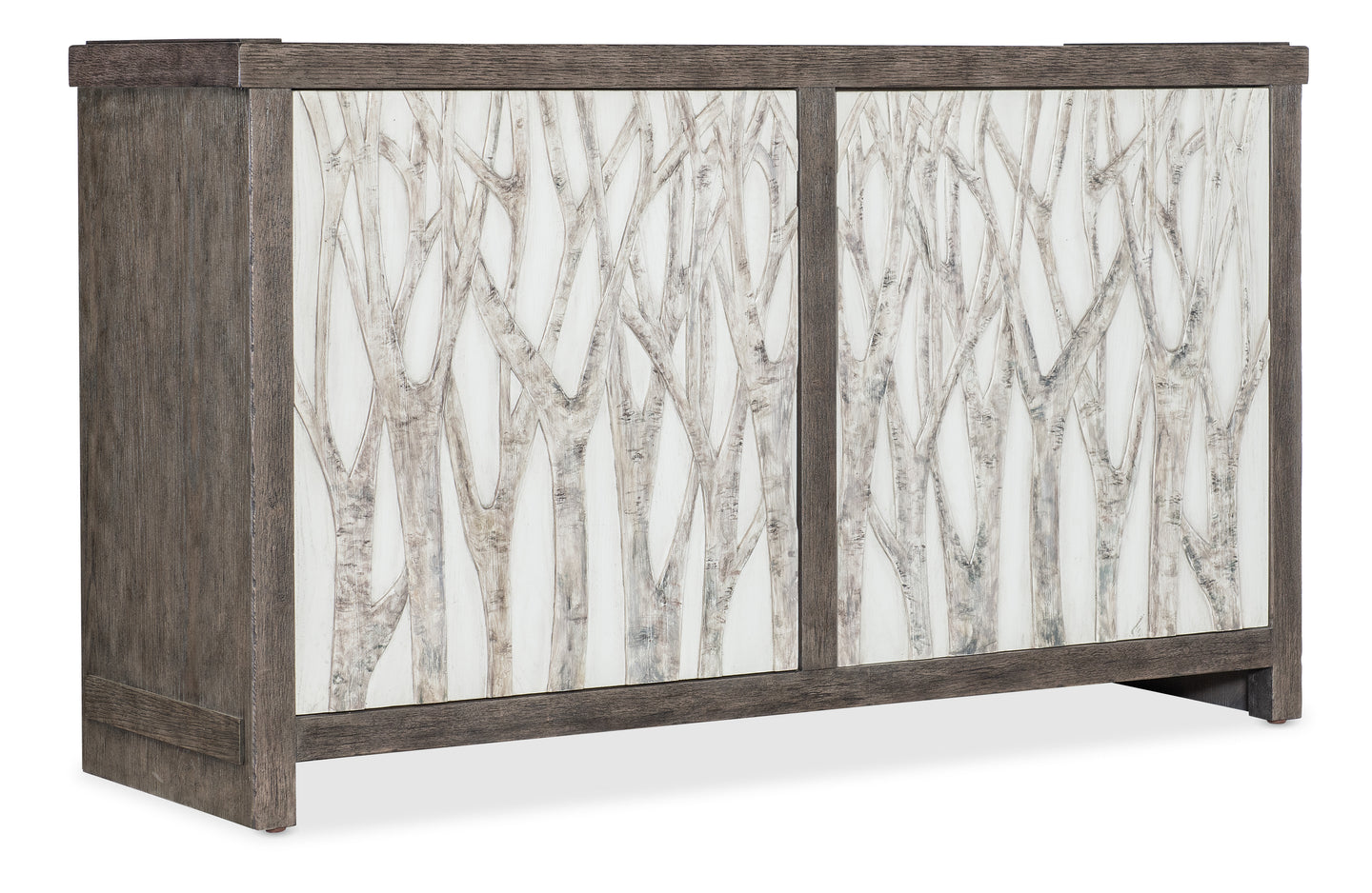 - Finish: Dark wood finish with raised tree and branch motif on contrasting white background on door fronts