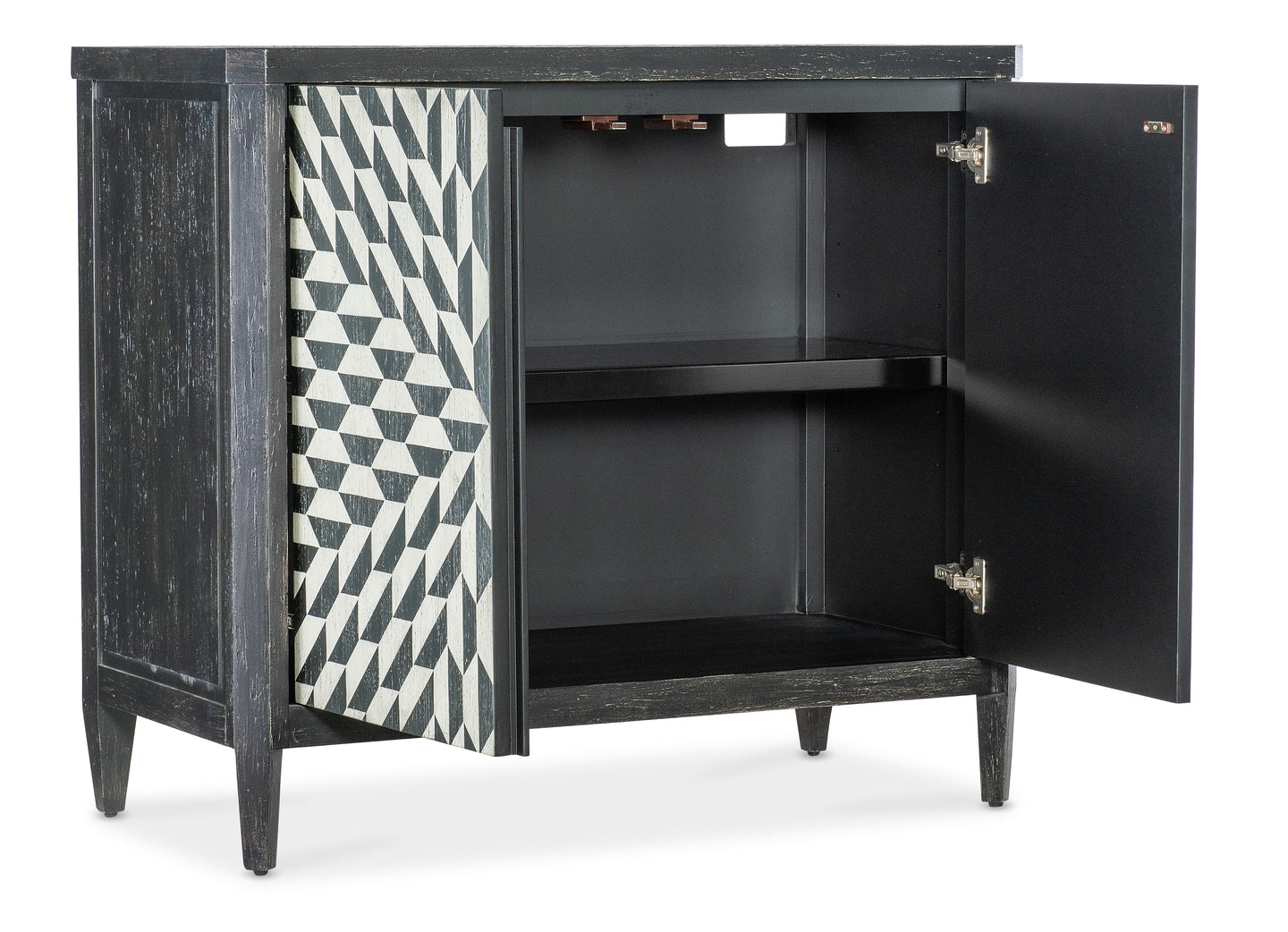 The Lancaster Hall Chest offers the classic and always-stylish black & white combination and timeless painted starburst pattern on the door fronts. Crafted of Maple Veneers, the two doors have soft-close hinges and magnetic door catches with one adjustable shelf behind the doors.