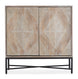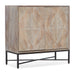 Offering a casual modern rustic design with a tribal flair, the Commerce & Market Two-Door Chest is crafted of Mango Solids and Iron with carved front doors with diamond motifs, There’s one adjustable wood shelf behind the doors and a metal base.