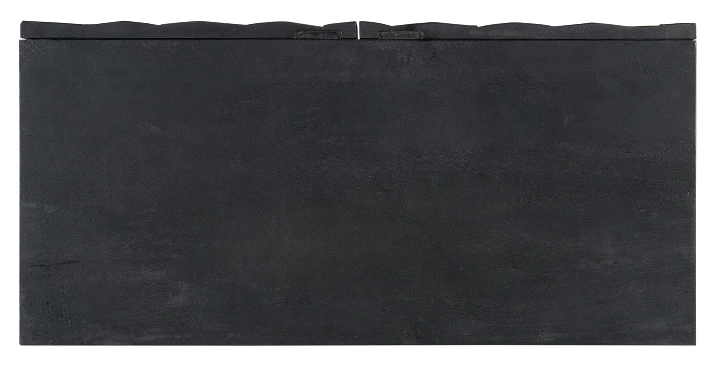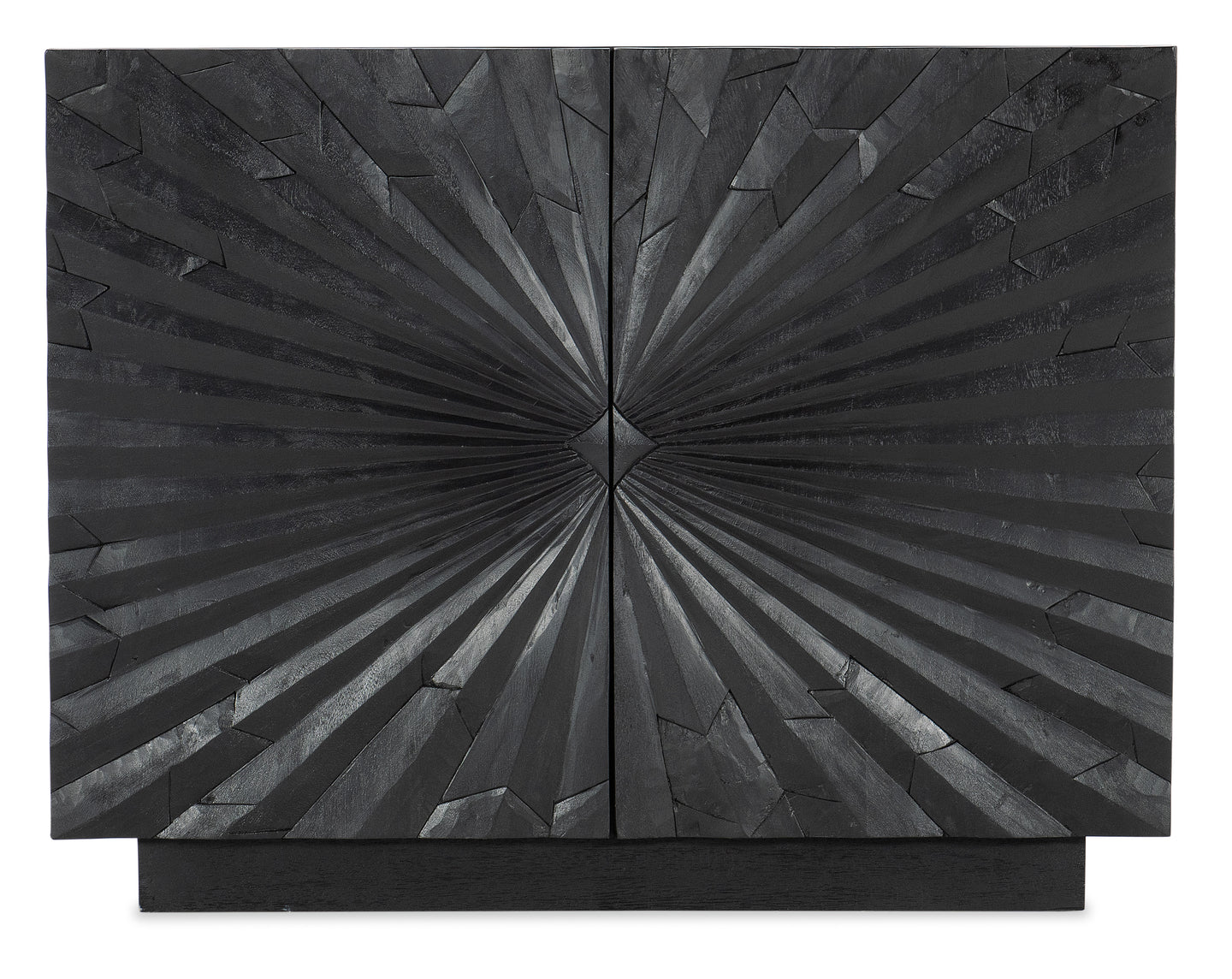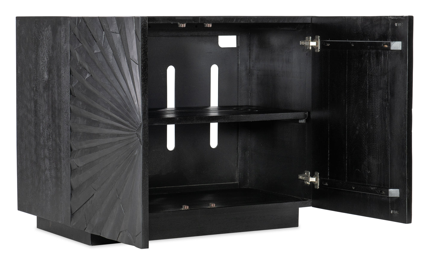 Infuse your room with energy with the Commerce & Market Two-Door Chest, featuring a star-burst motif on the door fronts. Crafted of Mango Solids, the chest has a transparent black wood finish that reveals color and grain variances for organic appeal. The doors have soft-close hinges and finger pull cut-outs and a fixed ventilated shelf behind.