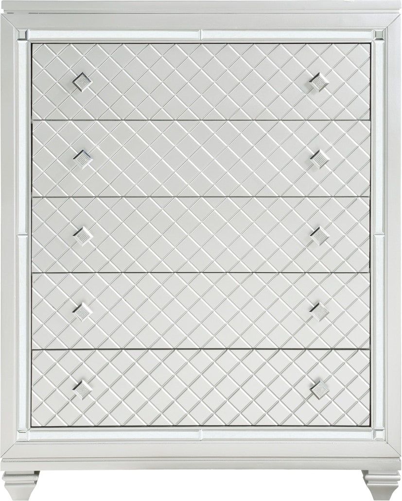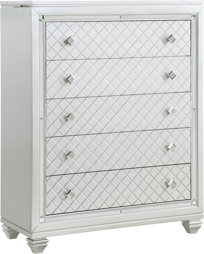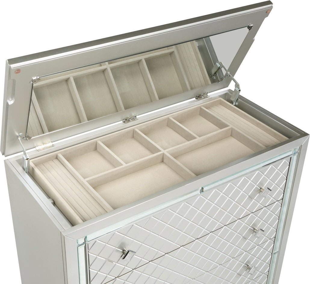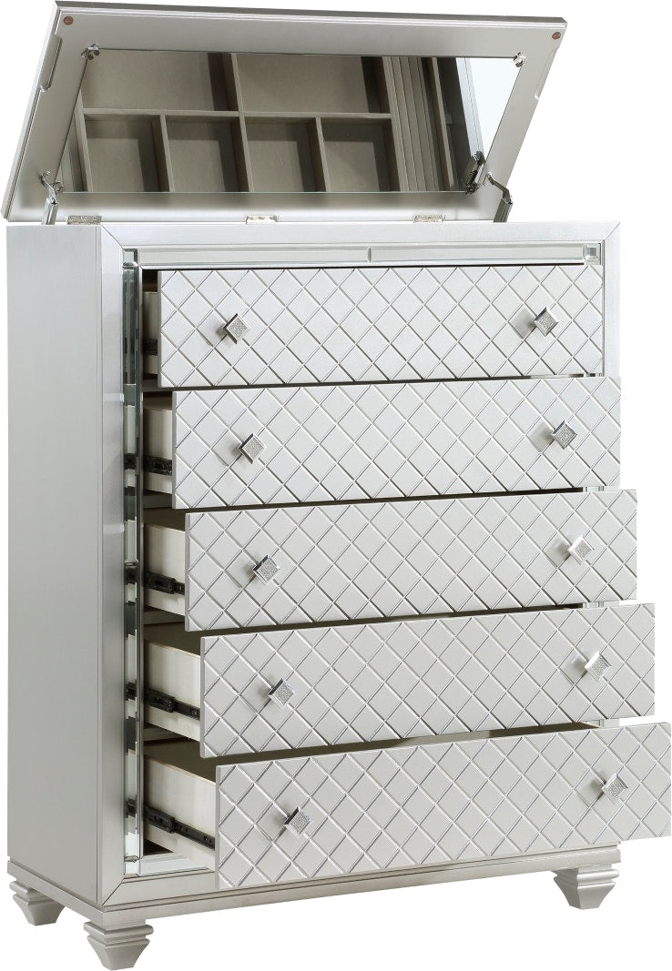 Product Description: The bold visual presentation of the Leesa Collection complements your glamorous design aspirations. Diamond pattern drawer fronts and hardware, and mirrored framing are featured on the silver-finished chest. The top of the chest opens to reveal a hidden jewelry compartment, its ease of use enhanced with a mirror mounted on the underside of the chest's top.