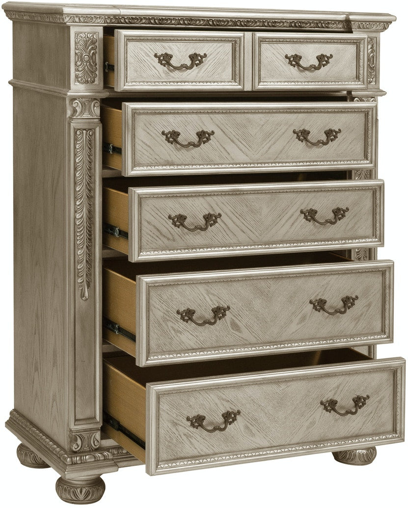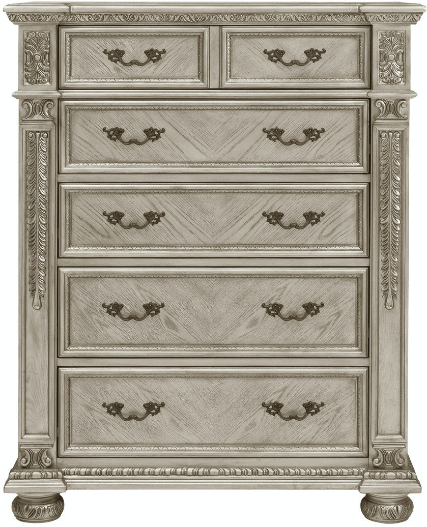 Product Description: Old-World European styling is captured in the dramatically elegant Catalonia Collection. Traditional design elements reign at every turn - egg and dart molding, acanthus leaf carving, bead molding, gold tipping and extravagant carvings - creating a sophisticated look for your bedroom. Each drawer front features dark bronze fixed-drop hardware with decorative flourish that furthers the elegant appointments that embellish this collection. A traditional platinum gold finish is utilized to highlight the oak veneer of the set and decorative inlay patterns found on the chest tops.