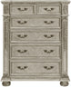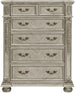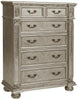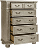 Specifications: Made of oak veneer, wood and engineered wood. Platinum gold finish. 5 dovetail drawers with ball bearing glides. Dark bronze drop handles. Assembly required. Prop 65 Information.