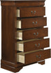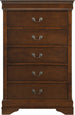 Product Description: Traditional in design and modest in scale, the elegant Mayville Collection takes its design inspiration from the classic Louis Philippe styling. The Okume veneer of the chest is paired with a brown cherry finish and is accentuated by antique brass tone drop handles.
