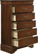 Specifications: Made of okume veneer, wood and engineered wood. Brown cherry finish. 5 drawers with metal on metal center glides. Antique brass tone drop handles. No assembly required. Prop 65 Information.
