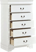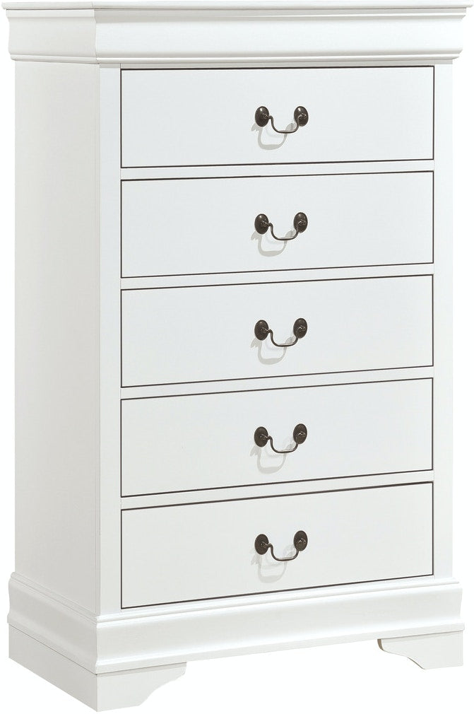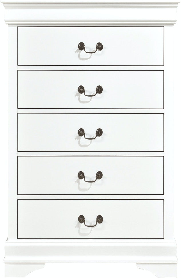 Product Description: Traditional in design and modest in scale, the elegant Mayville Collection takes its design inspiration from the classic Louis Philippe styling. The Okume veneer of the chest is paired with a white finish and is accentuated by antique brass tone drop handles.