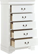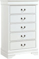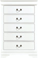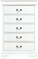 Specifications: Made of okume veneer, wood and engineered wood. White finish. 5 drawers with metal on metal center glides. Antique brass tone drop handles. No assembly required. Prop 65 Information.