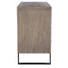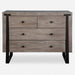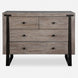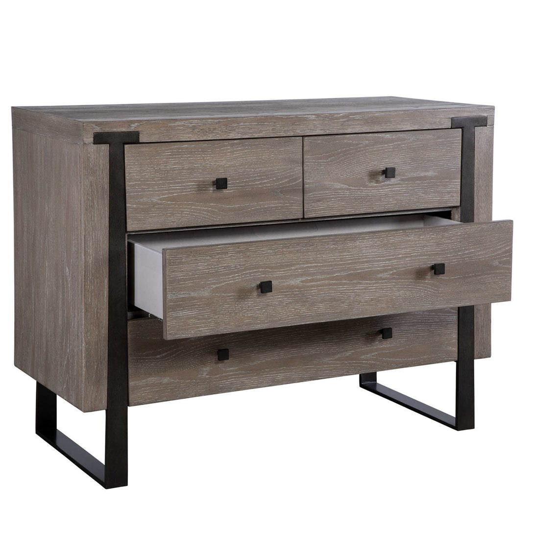 Contemporary in style, this light oak veneer chest features dark bronze iron legs that embed into the front face. Coordinating hardware decorate the soft closing drawers.