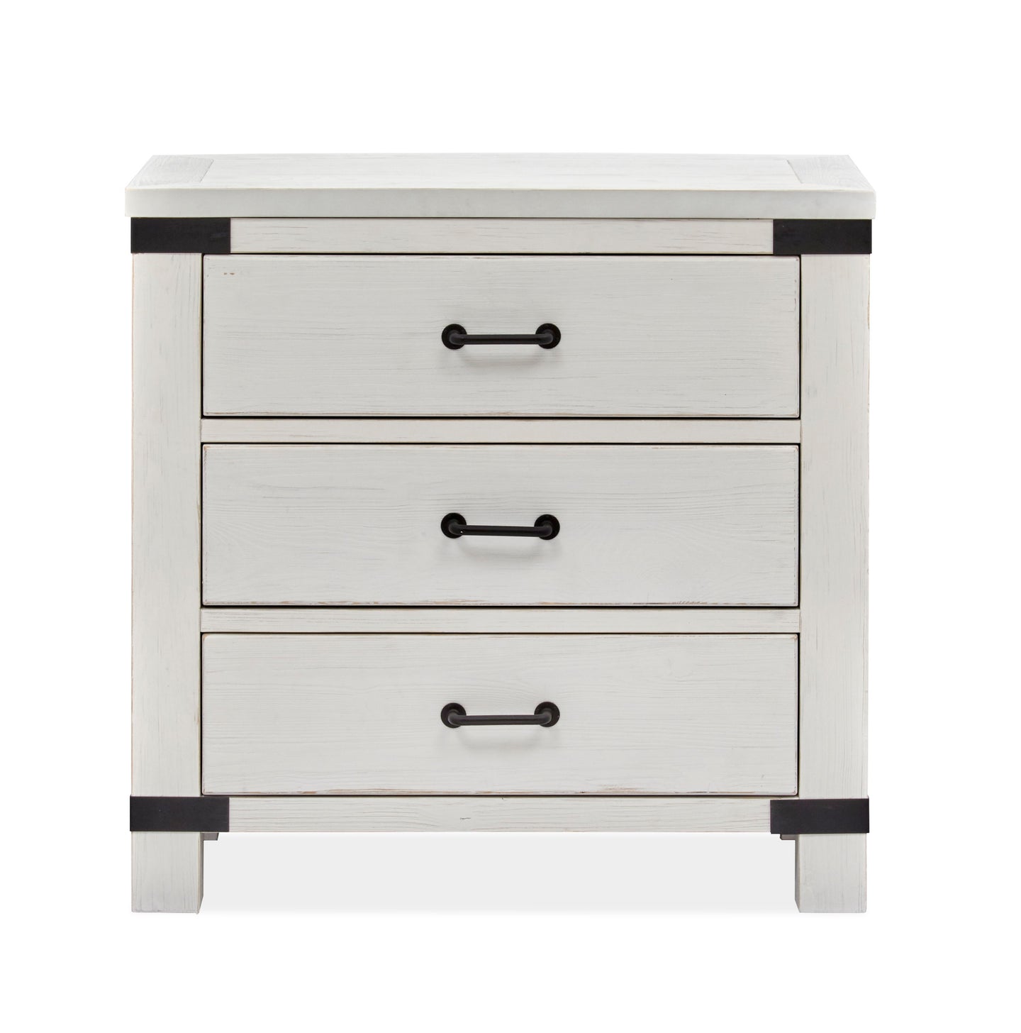 Farmhouse fresh meets industrial chic in the Harper Springs Collection. The board-and-batten construction of the signature panel bed evokes architectural details from 19th and 20th Century farmhouses, and window-pane motifs in textured glass on key pieces are inspired by the black metal windows of classic farmhouses and reclaimed factories. Black metal ferrules, corner brackets and forged iron hardware bring an industrial modern vibe to the craftsmen-like silhouettes. A black metal bed and a black mirror with window-pane border provide a dramatic contrast to the soft Silo White finish with rub-through and distressing. Harper Springs is crafted of random-width solid Pine for an authentic and casual feel. Whether you aspire to loft living or country living, the Harper Springs Collection will bring your dream home to life.