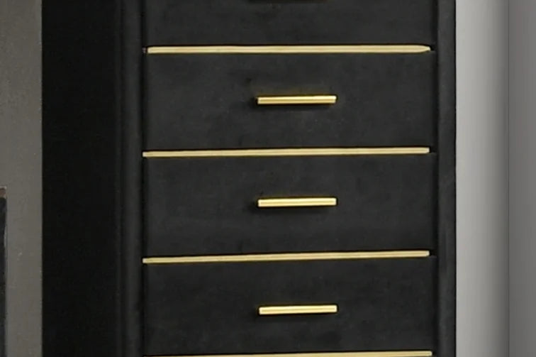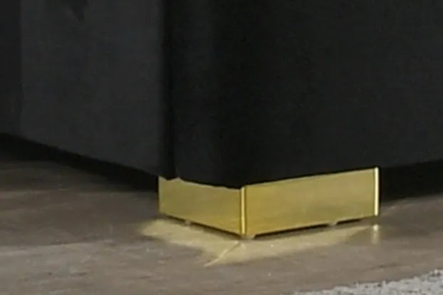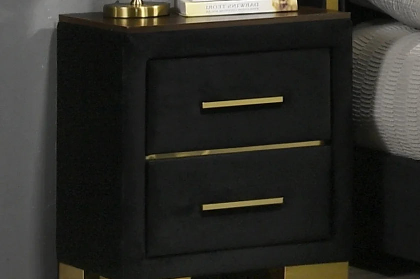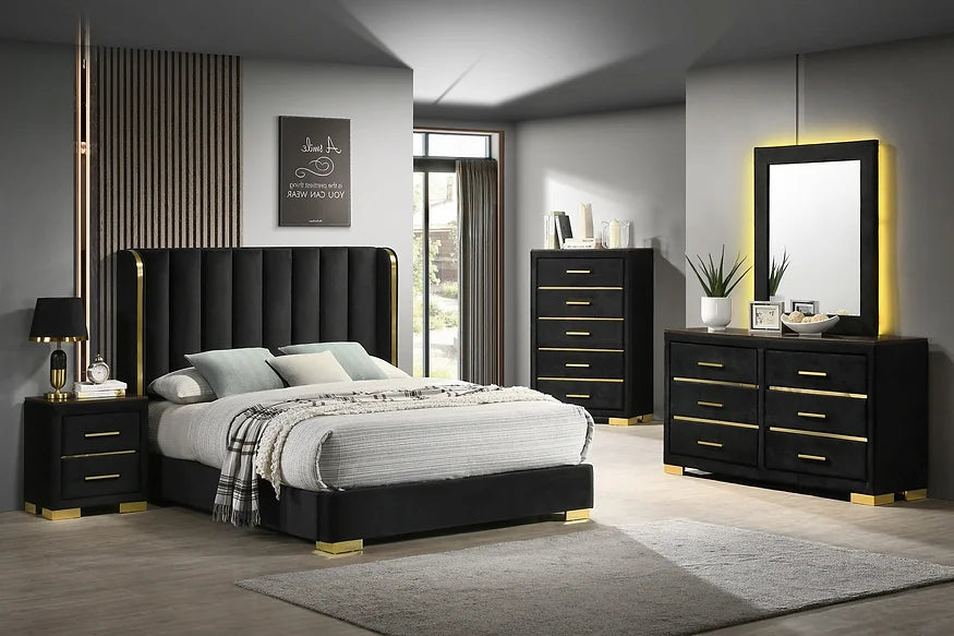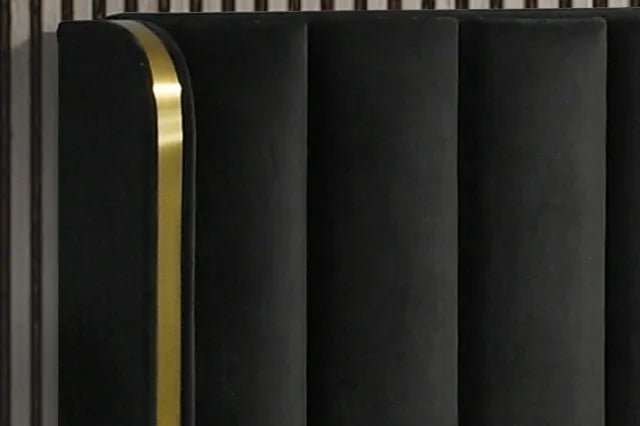 The bed features a show-stopping black velvet headboard with deep vertical tufting and dramatic gold accent wings, while the matching case pieces bring it all together with sleek gold hardware and legs. Built from tropical wood (MDF and veneers), this collection offers style and substance in equal measure.